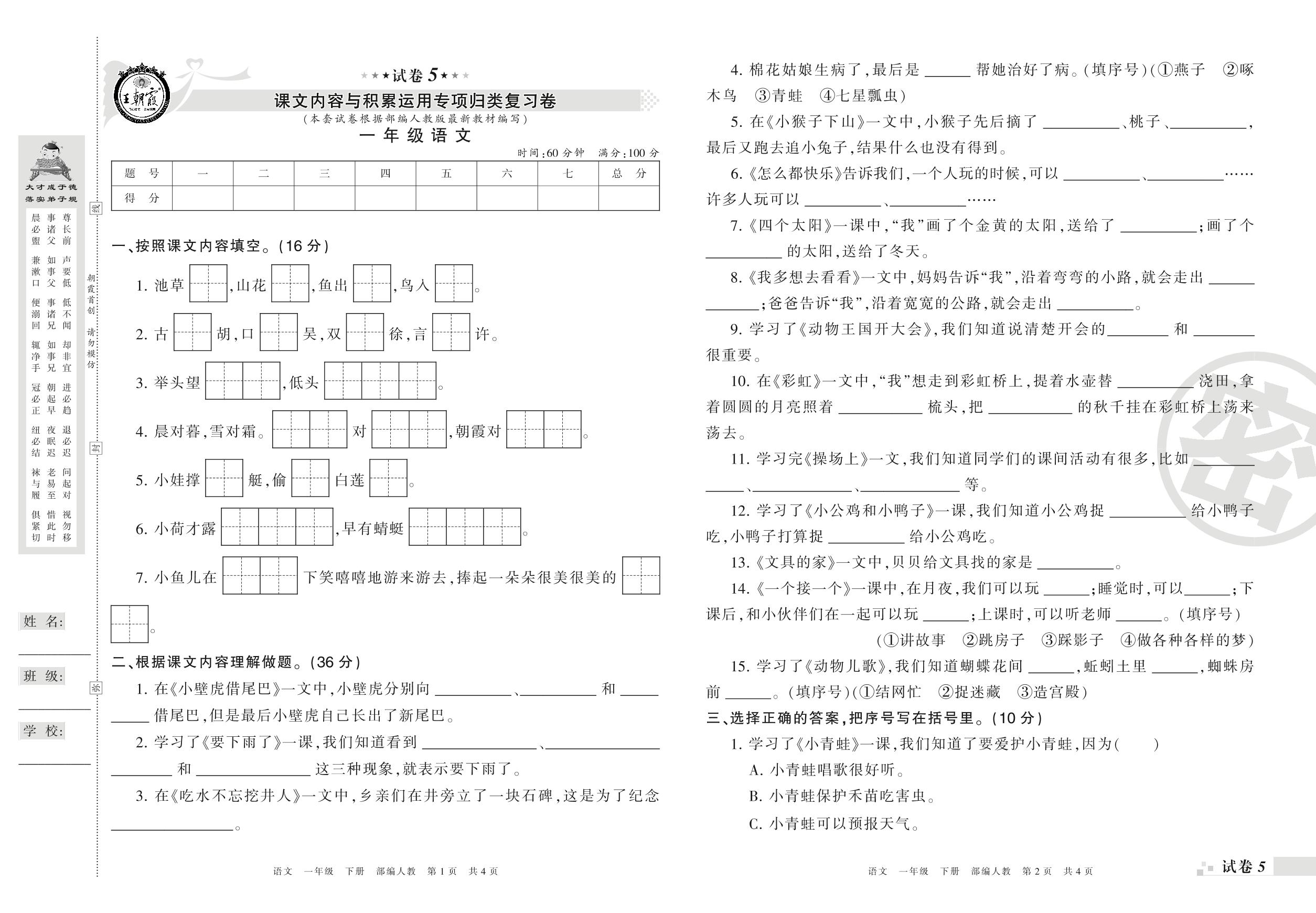 王朝霞期末专项卷——课文内容与积累运用专项归类一年级下册语文(人教版)_R210731190603【5】