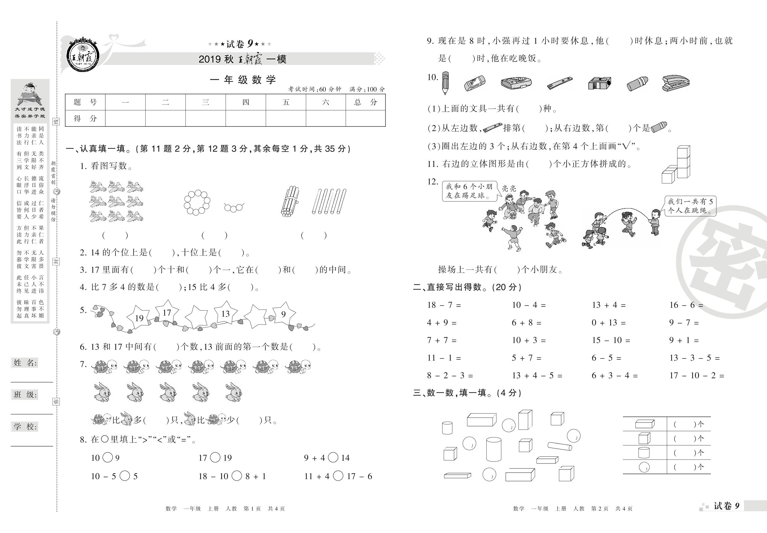 王朝霞期末模拟卷一年级上册数学(人教版)_R210802215810【9】