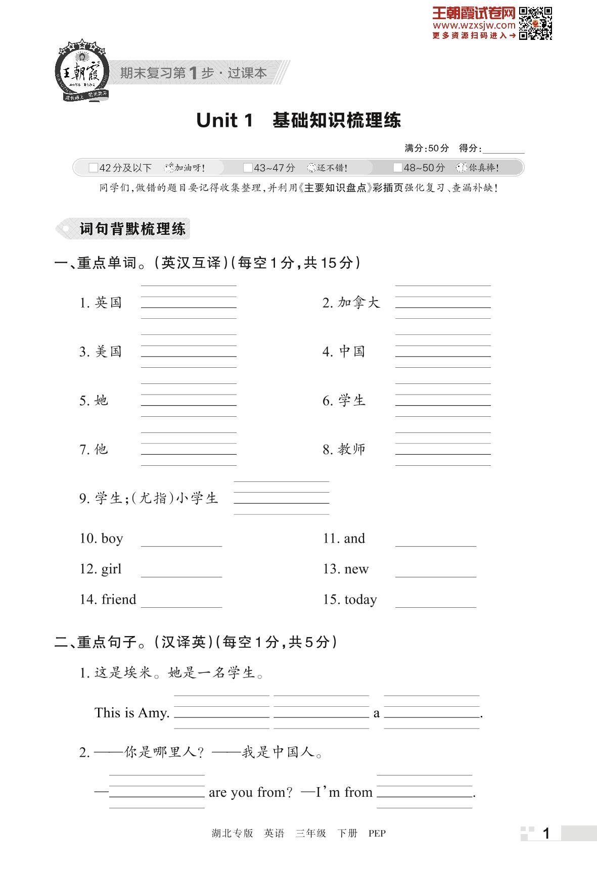 王朝霞期末过课本——Unit 1 基础知识梳理练三年级下册英语(PEP版)_R230423171720340