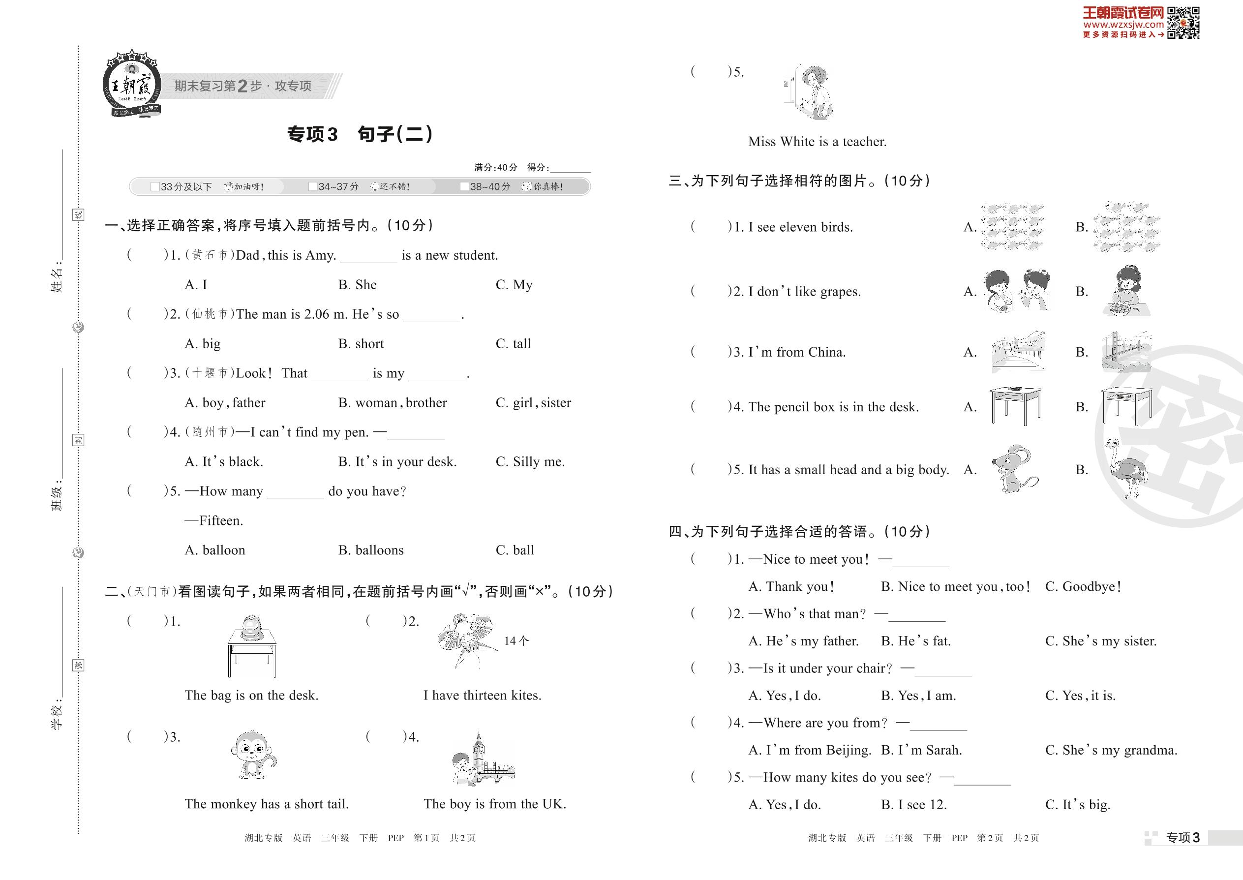 王朝霞期末专项卷——句子(二)三年级下册英语(PEP版)_R230423171720994【3】