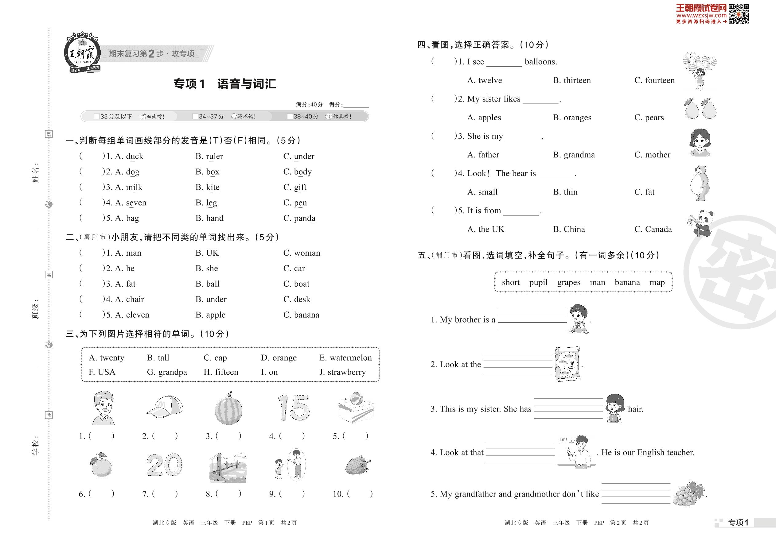 王朝霞期末专项卷——语音与词汇三年级下册英语(PEP版)_R230423171721832【1】