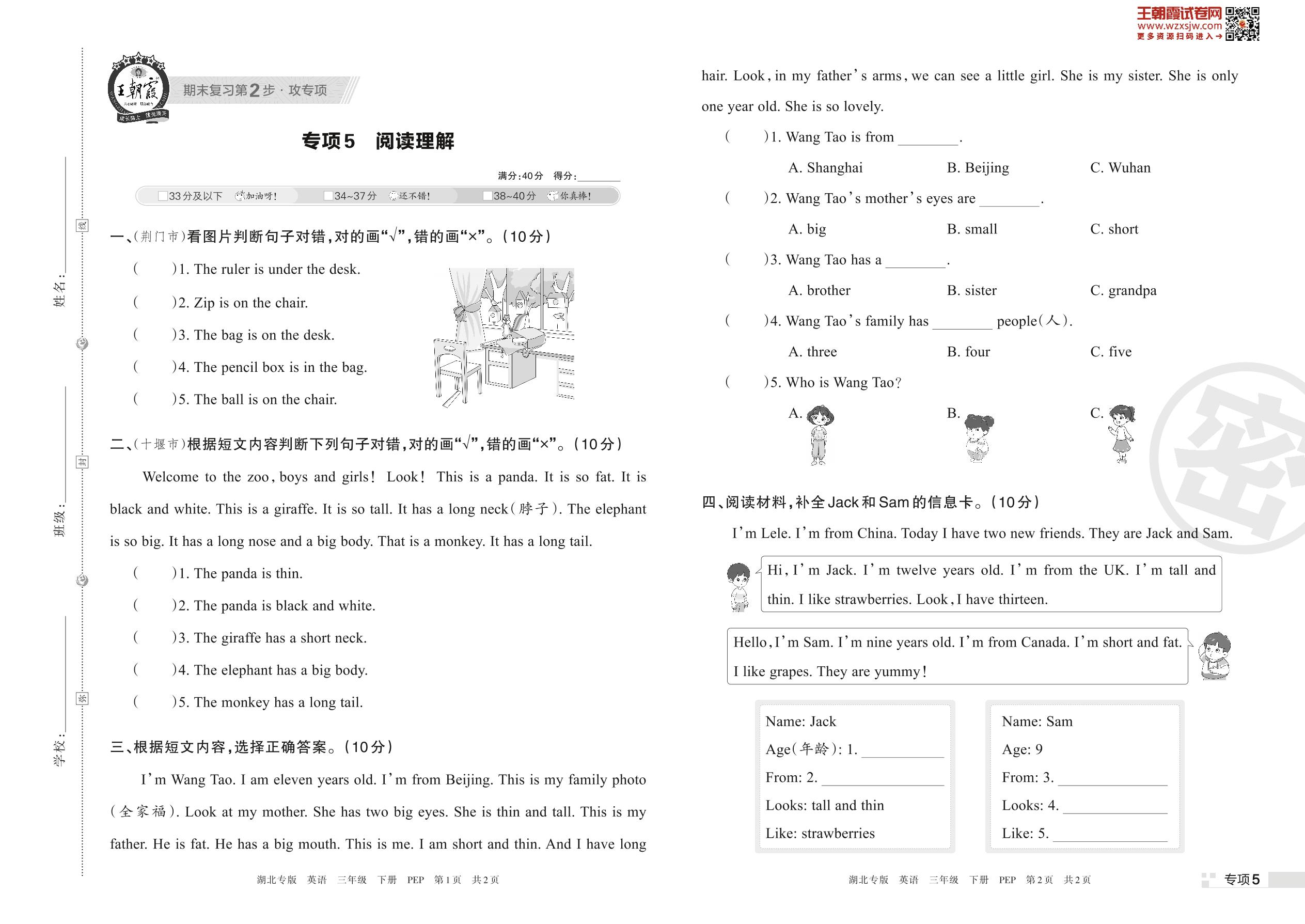 王朝霞期末专项卷——阅读理解三年级下册英语(PEP版)_R230423171721245【5】