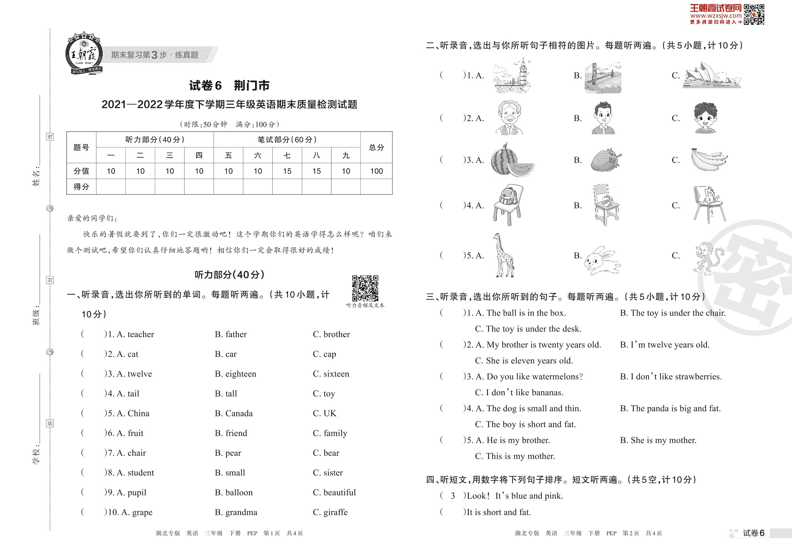 荆门市2021—2022学年度下学期三年级英语期末质量检测试题(PEP版)【6】