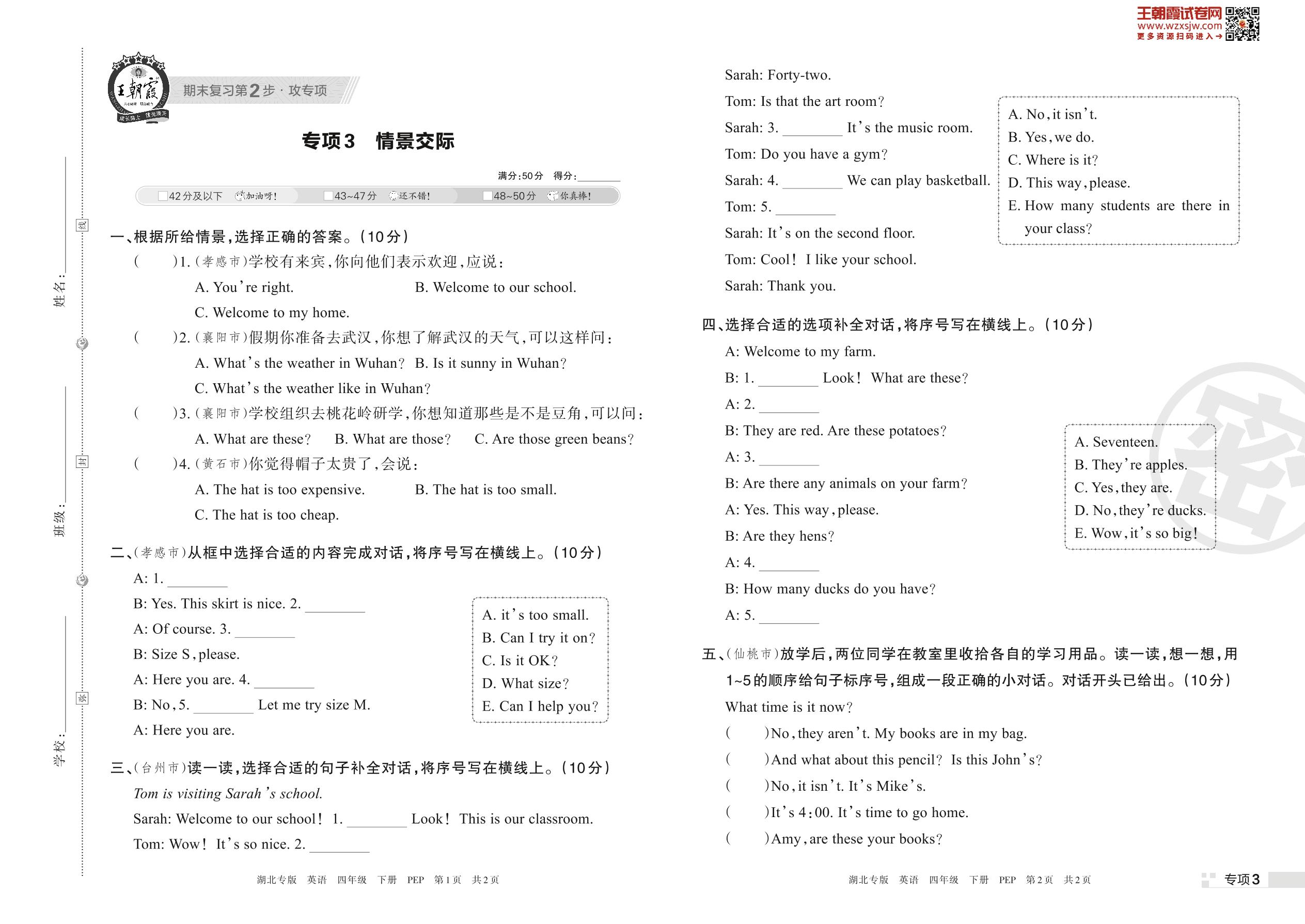王朝霞期末专项卷——情景交际四年级下册英语(PEP版)_R230423172239798【3】