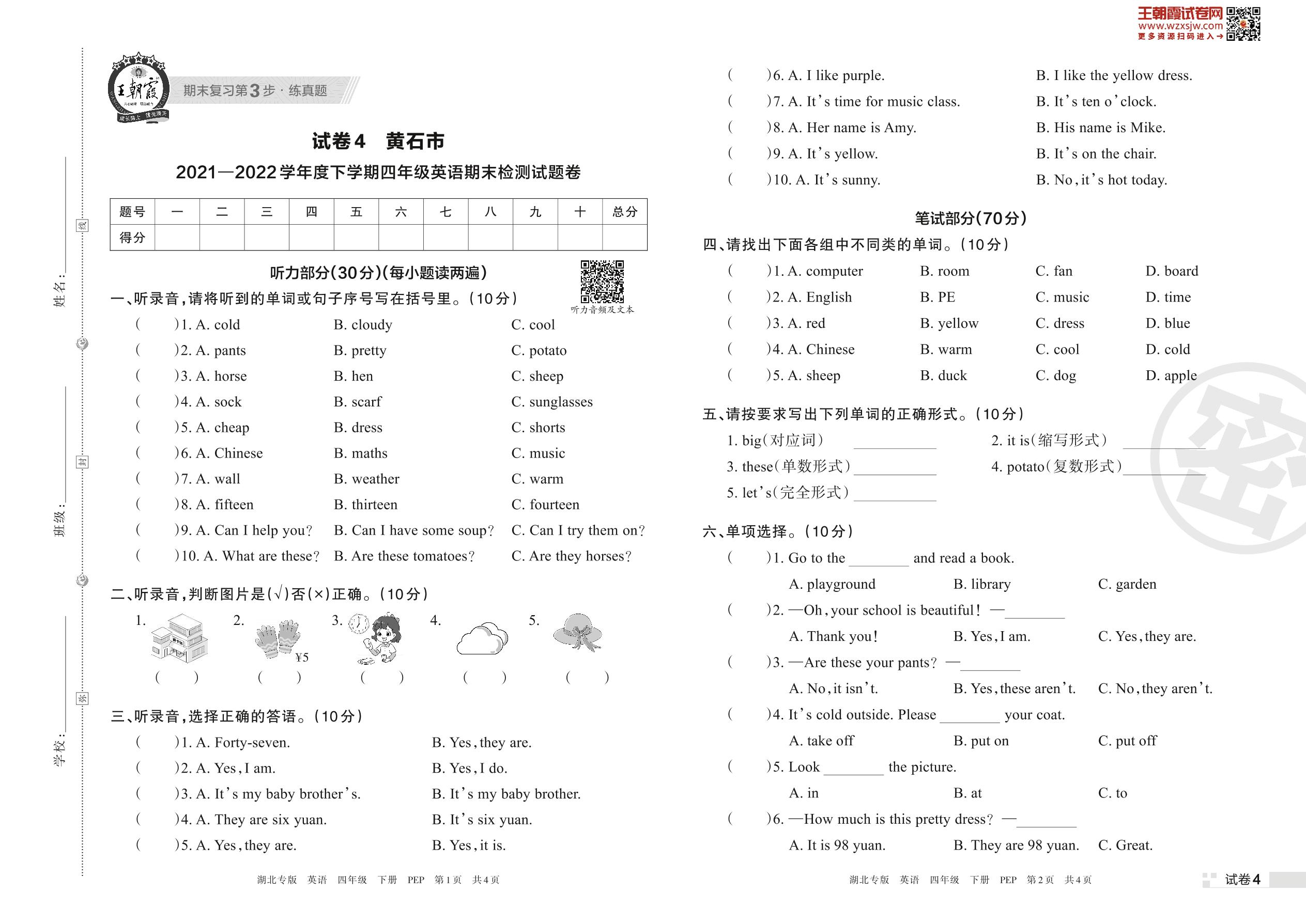 黄石市2021—2022学年度下学期四年级英语期末检测试题卷(PEP版)【4】