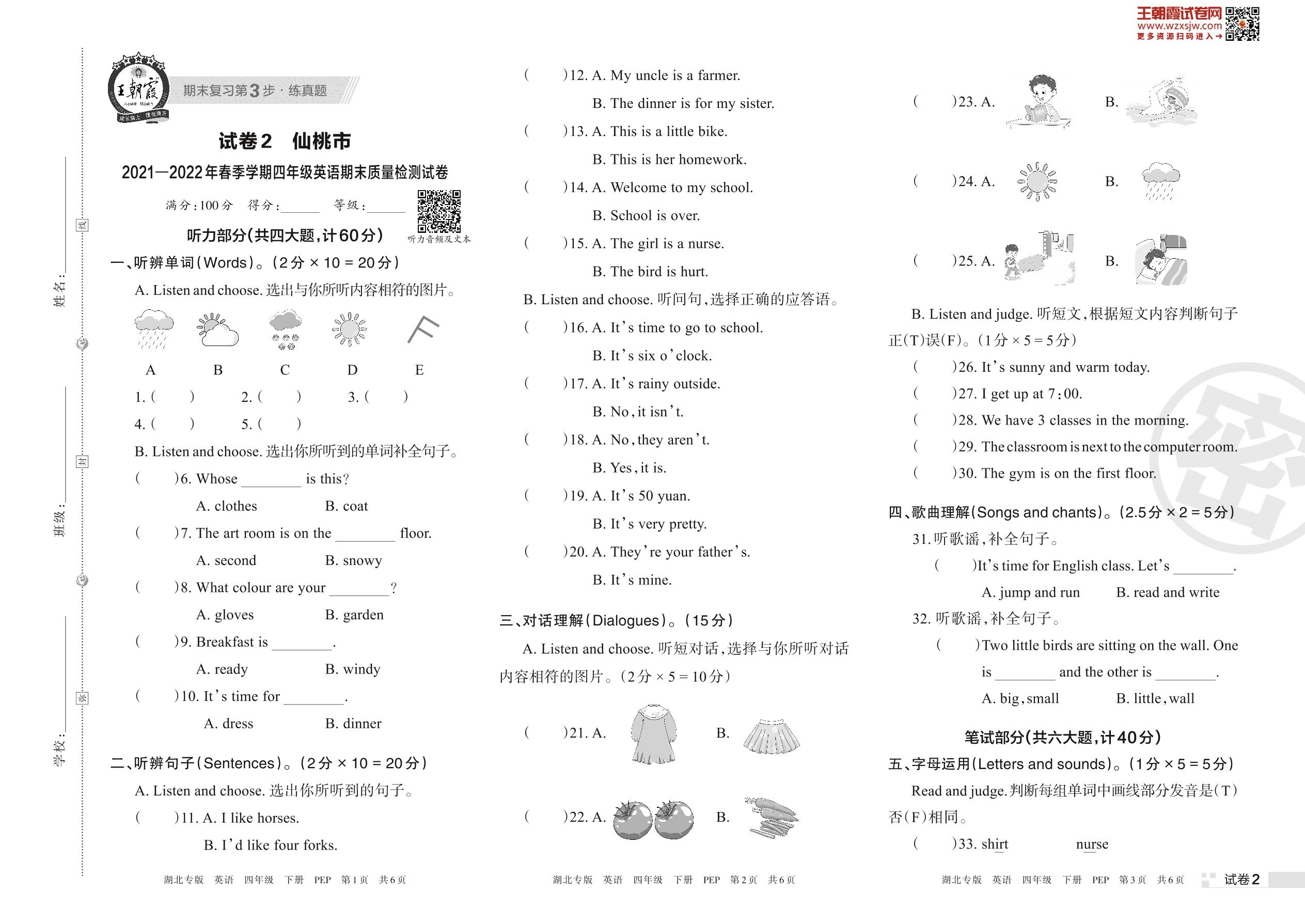 仙桃市2021—2022年春季学期四年级英语期末质量检测试卷(PEP版)【2】