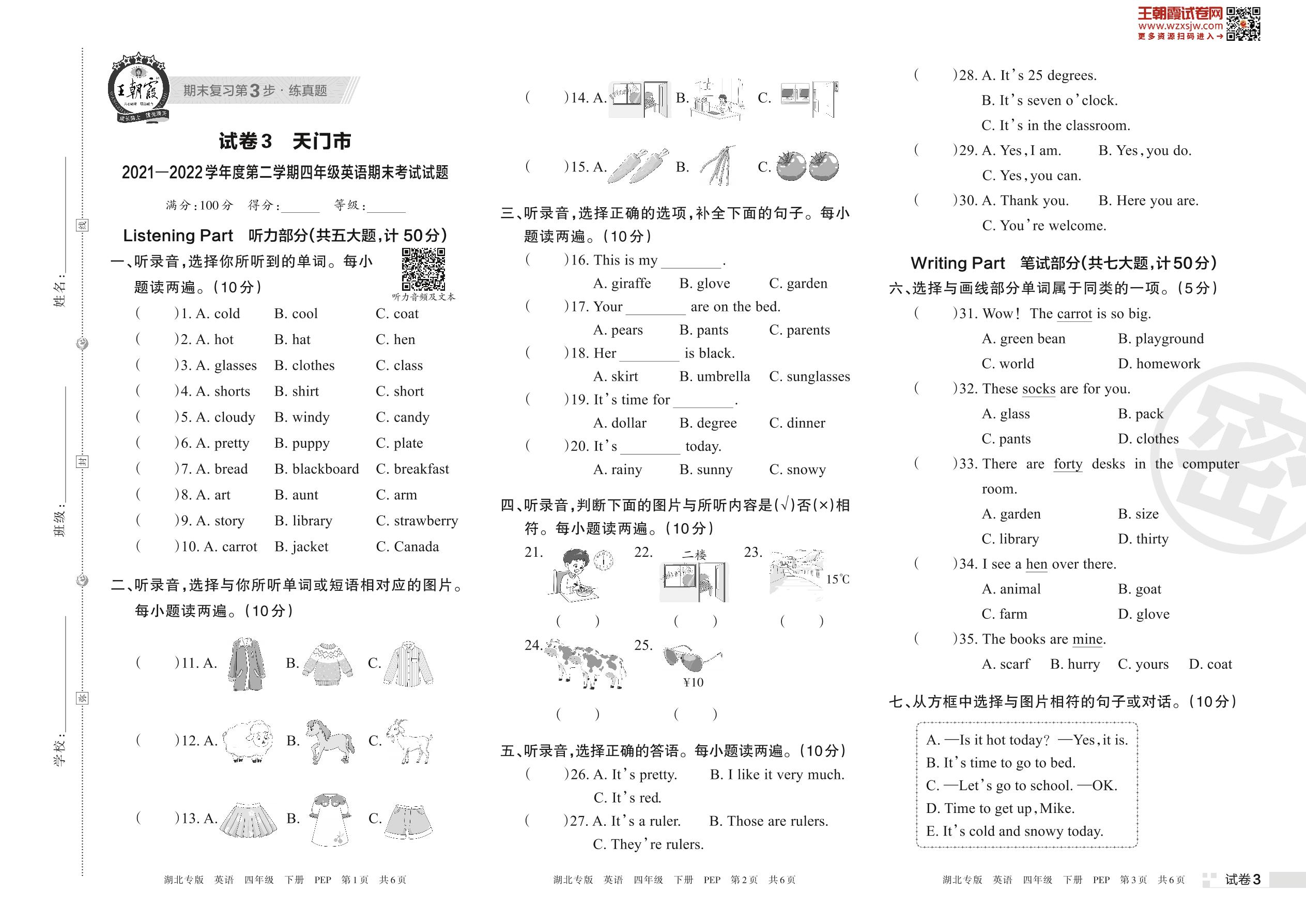 天门市2021—2022学年度第二学期四年级英语期末考试试题(PEP版)【3】