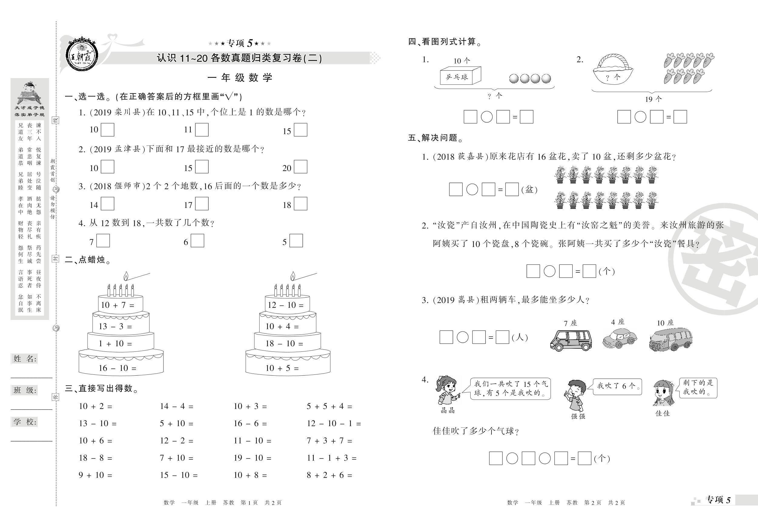 王朝霞期末专项卷——认识10~20各数、20以内的进位加法真题归类复习一年级上册数学(苏教版)_R210802215824【0】