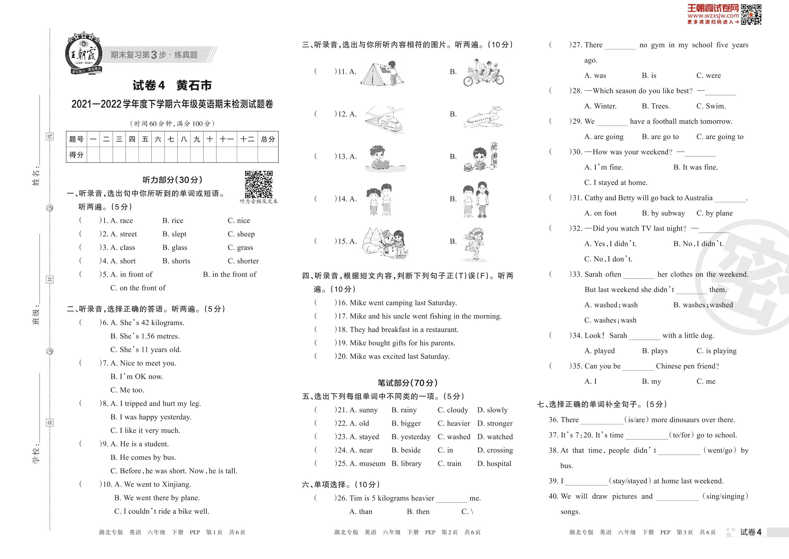 黄石市2021—2022学年度下学期六年级英语期末检测试题卷(PEP版)【4】