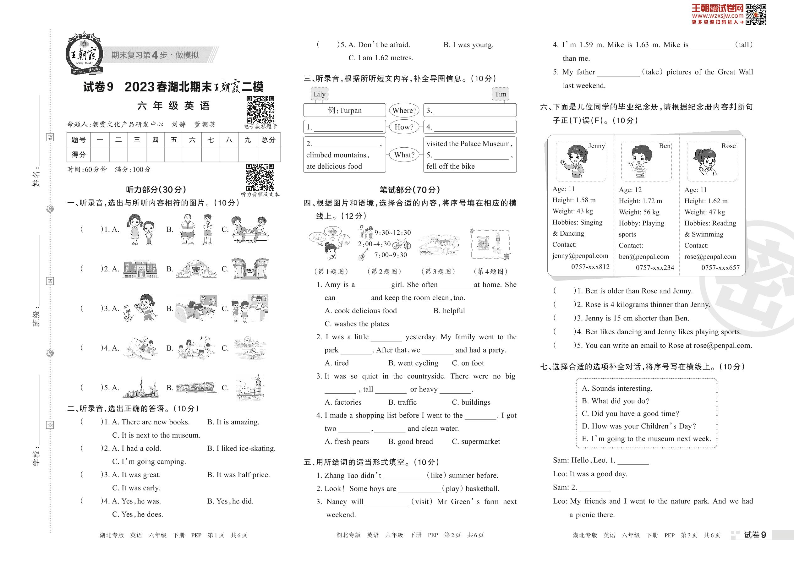 王朝霞期末模拟卷六年级下册英语(PEP版)_R230423172752219【9】