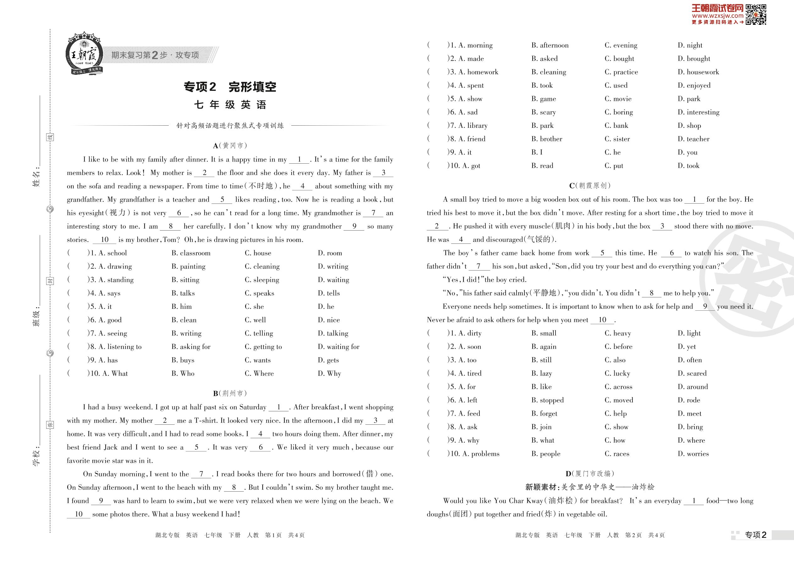 王朝霞期末专项卷——完形填空七年级下册英语(人教版)_R230423173512881【2】