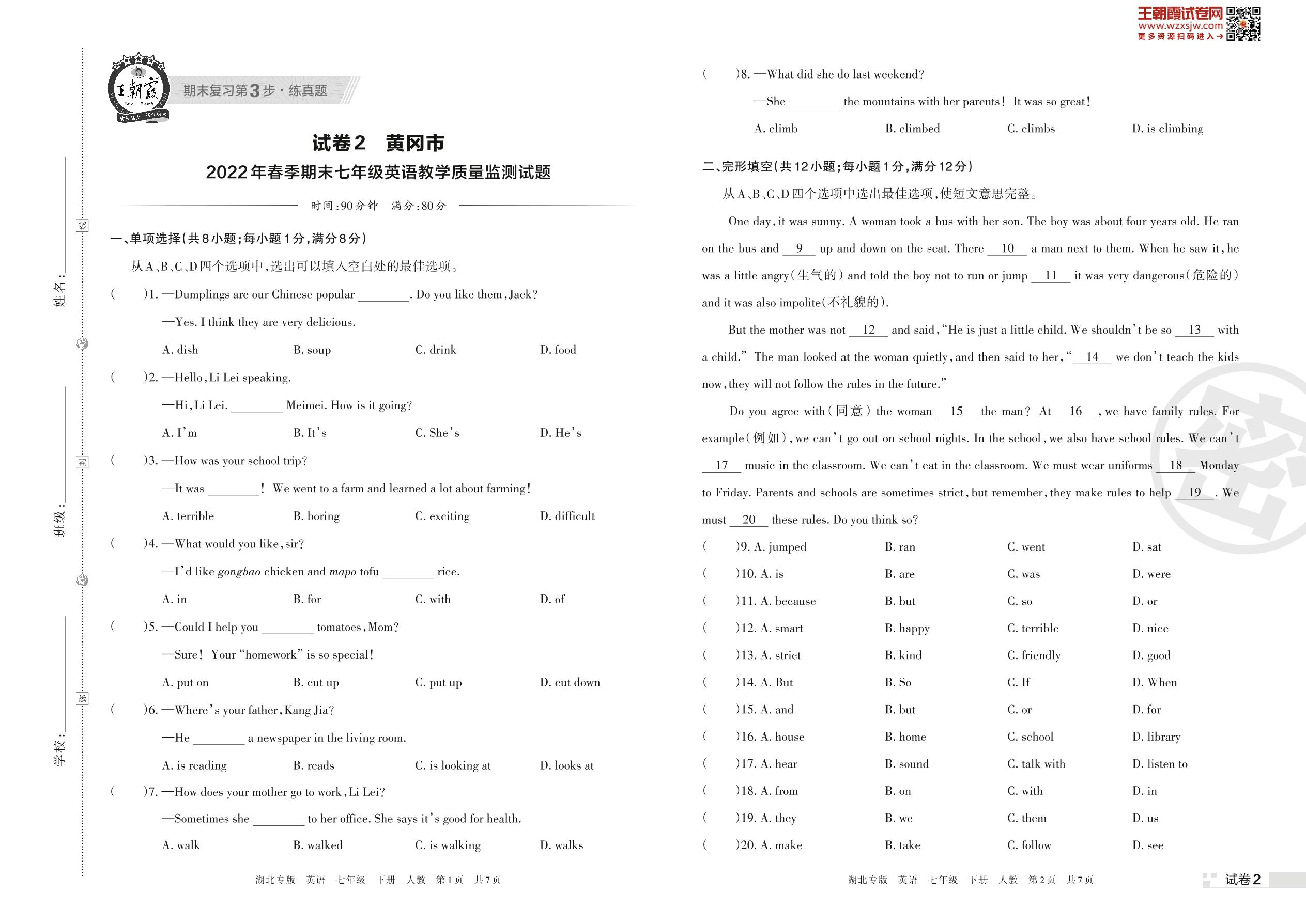 黄冈市2022年春季期末七年级英语教学质量监测试题(人教版)【2】