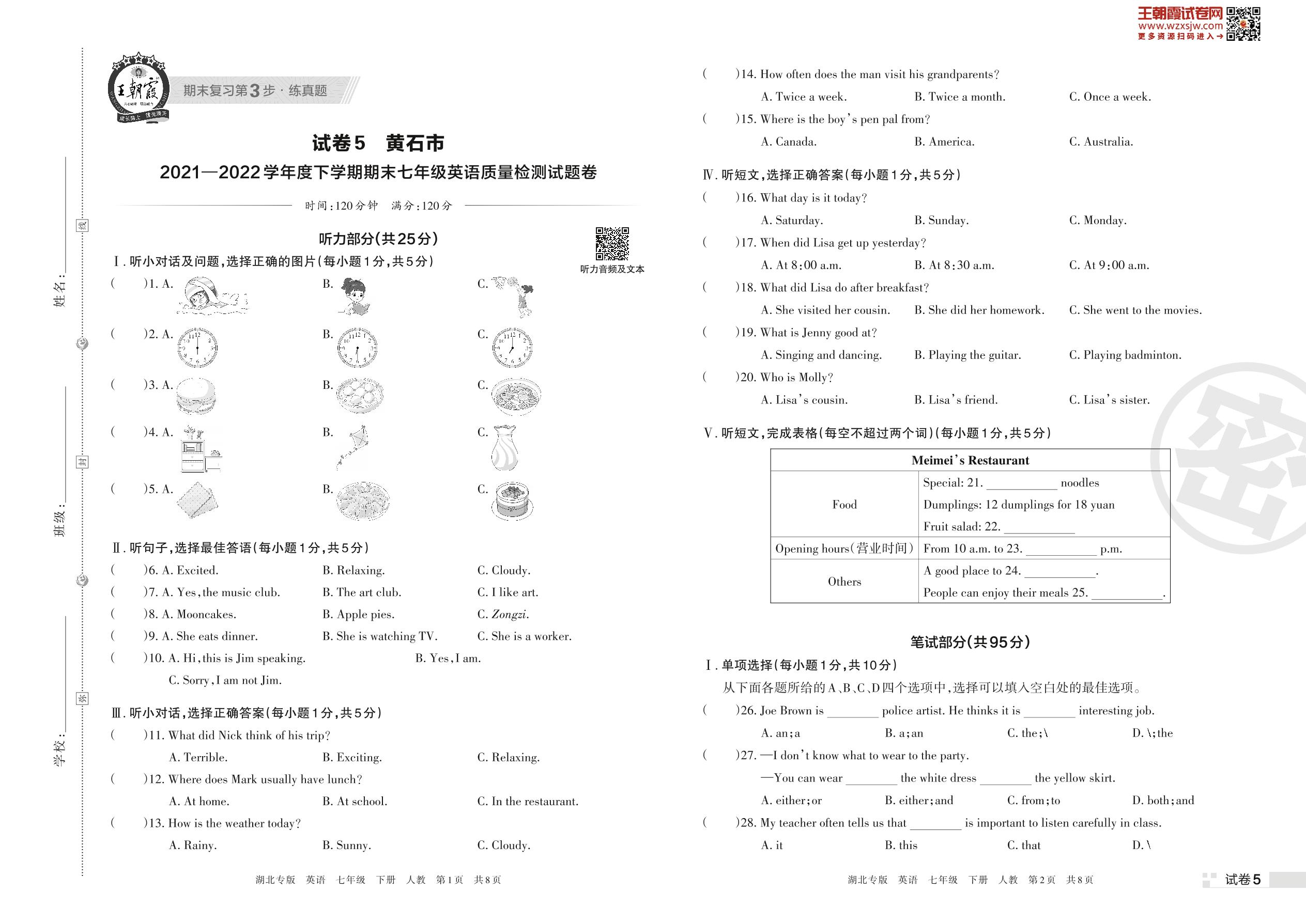 黄石市2021—2022学年度下学期期末七年级英语质量检测试题卷(人教版)【5】