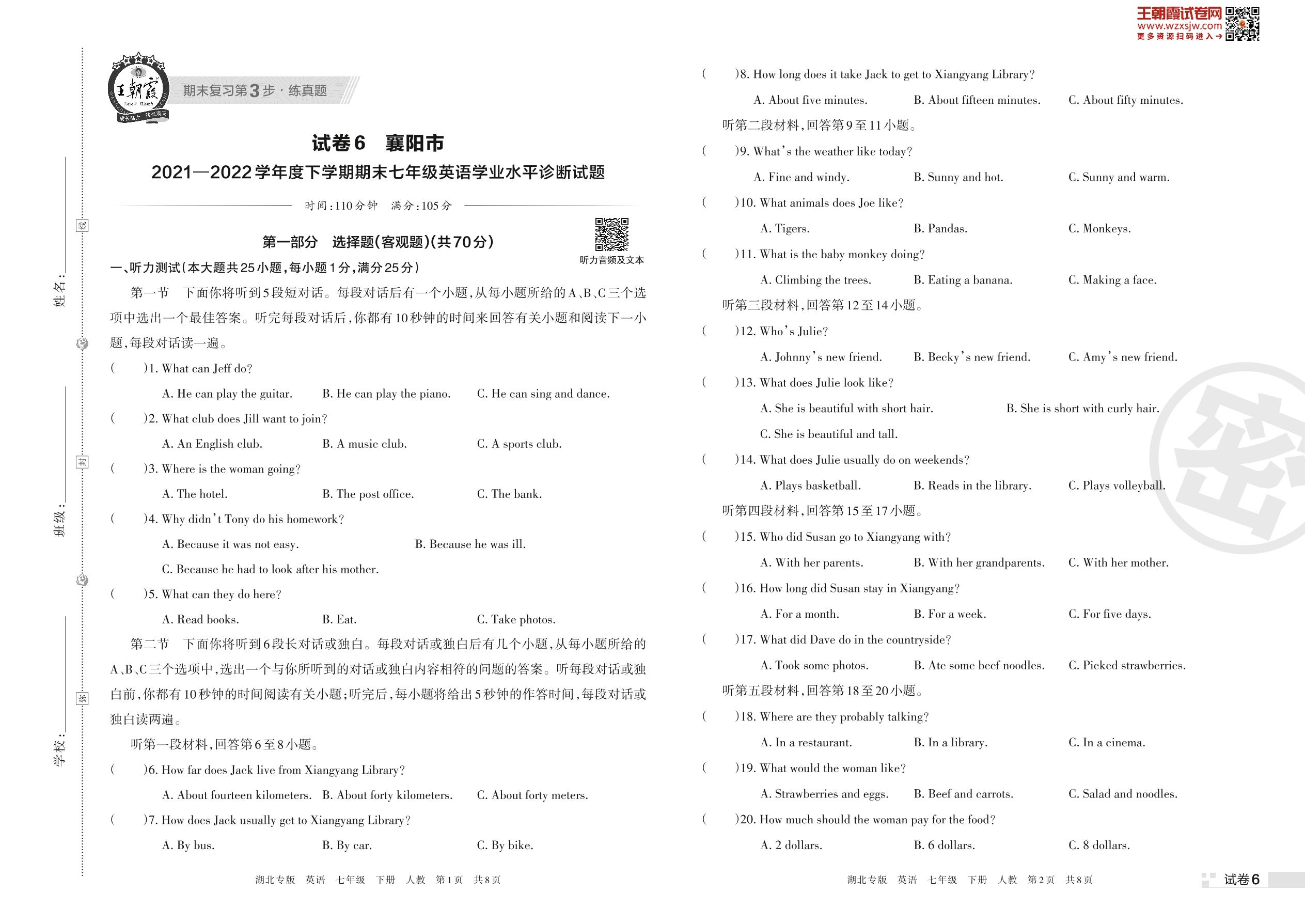 襄阳市2021—2022学年度下学期期末七年级英语学业水平诊断试题(人教版)【6】