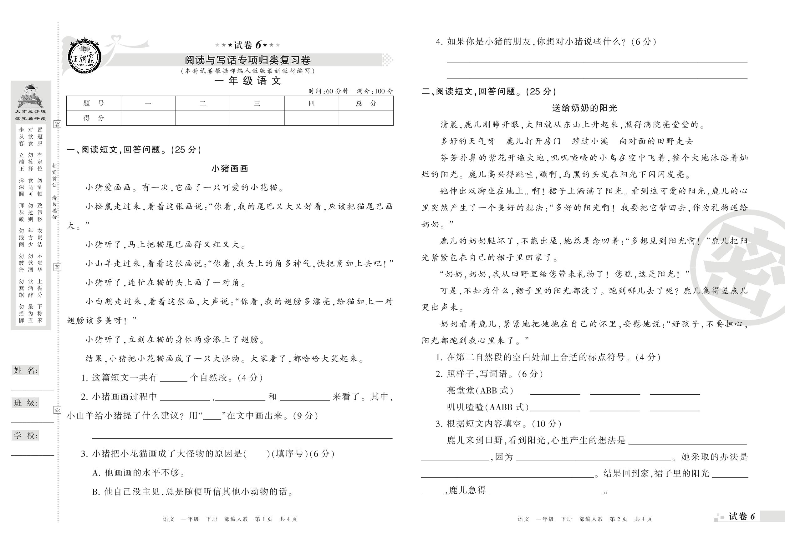王朝霞期末专项卷——阅读与写话专项归类复习卷一年级下册语文(人教版)_R210731190606【6】