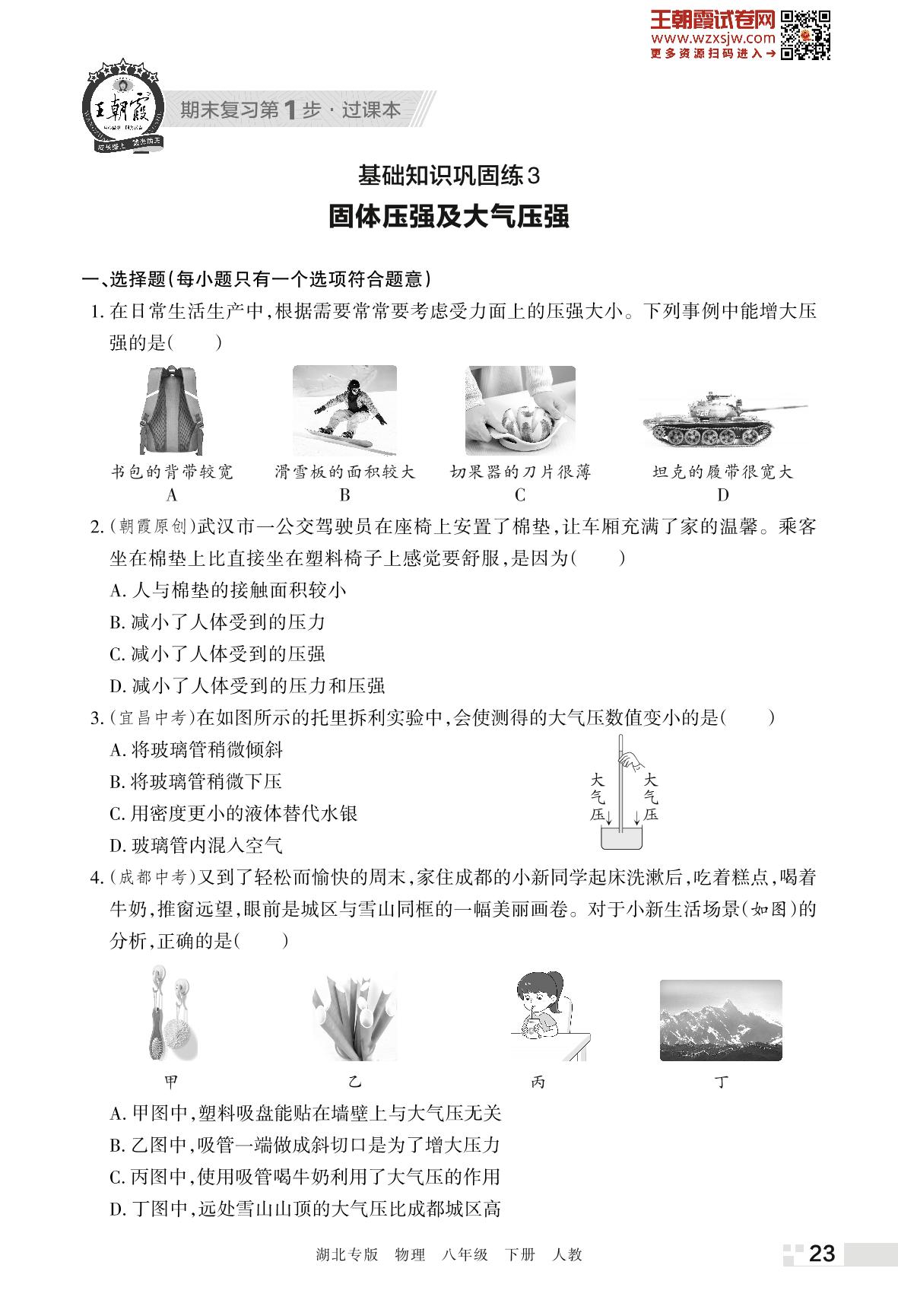 王朝霞期末过课本——基础知识巩固练3 固体压强及大气压强八年级下册物理(人教版)_R230423174048672