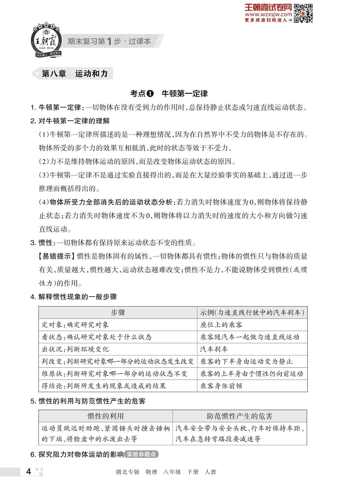 王朝霞期末知识梳理——第八章 运动和力八年级下册物理(人教版)