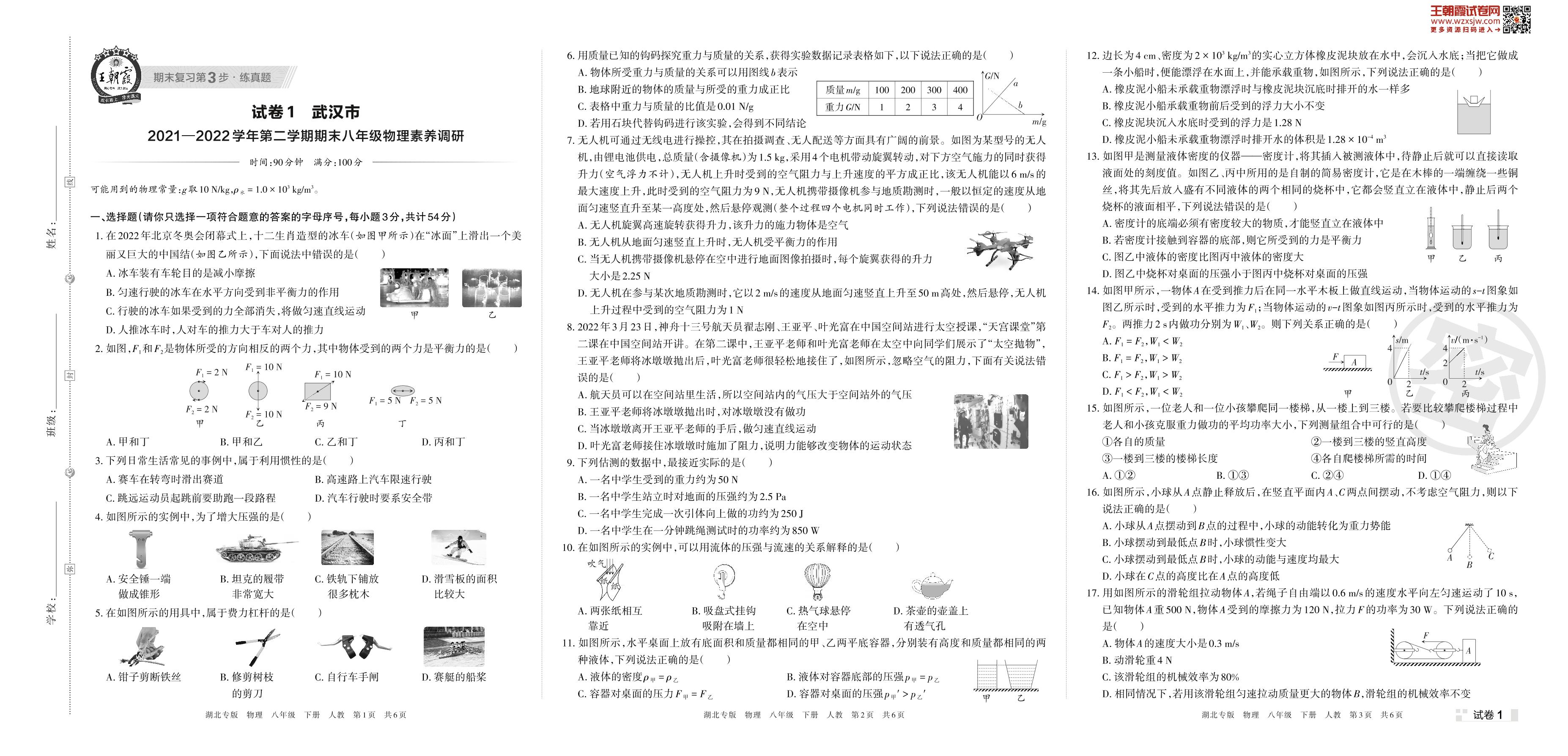 武汉市2021—2022学年第二学期期末八年级物理素养调研(人教版)【1】