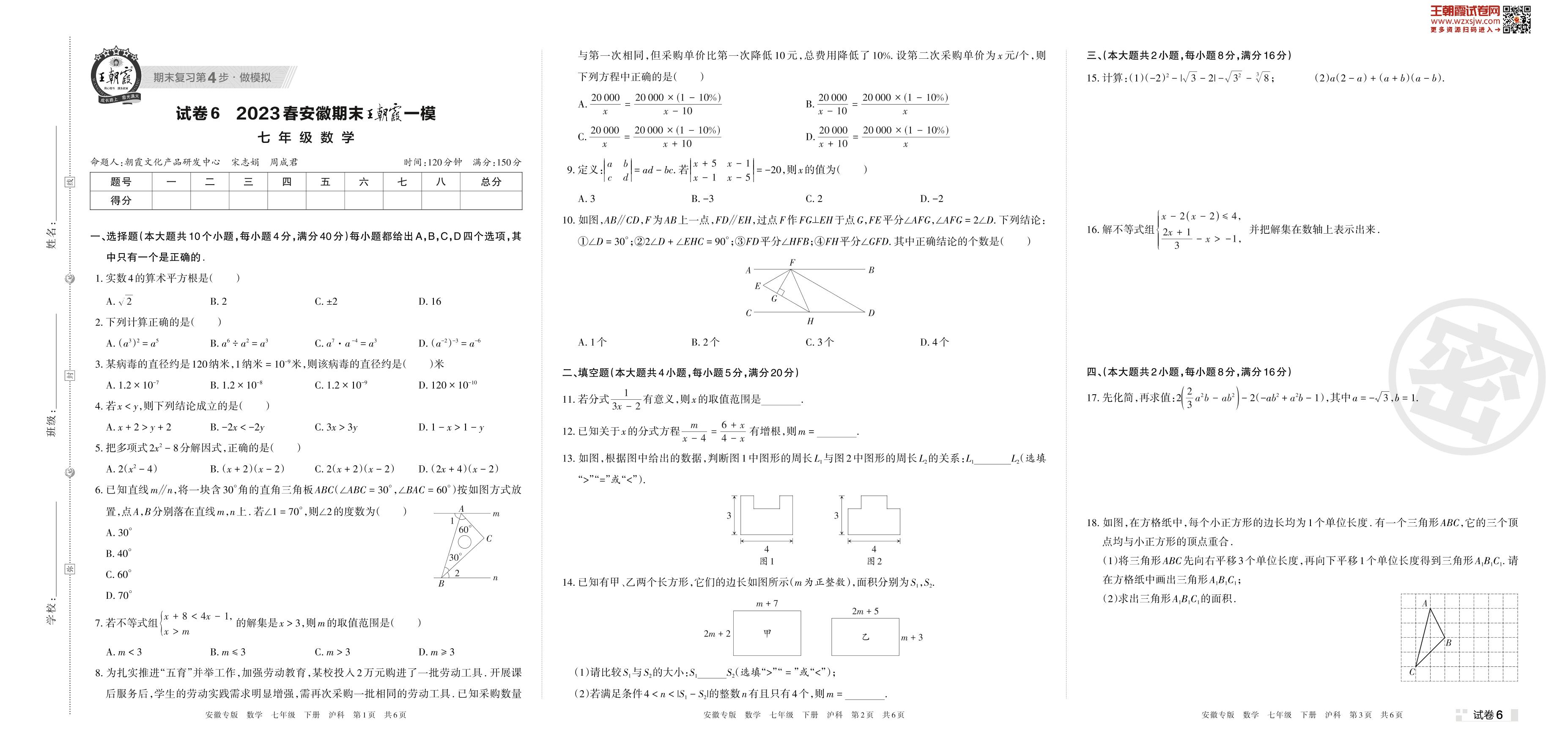 王朝霞期末模拟卷七年级下册数学(沪科版)_R230424095049952【6】