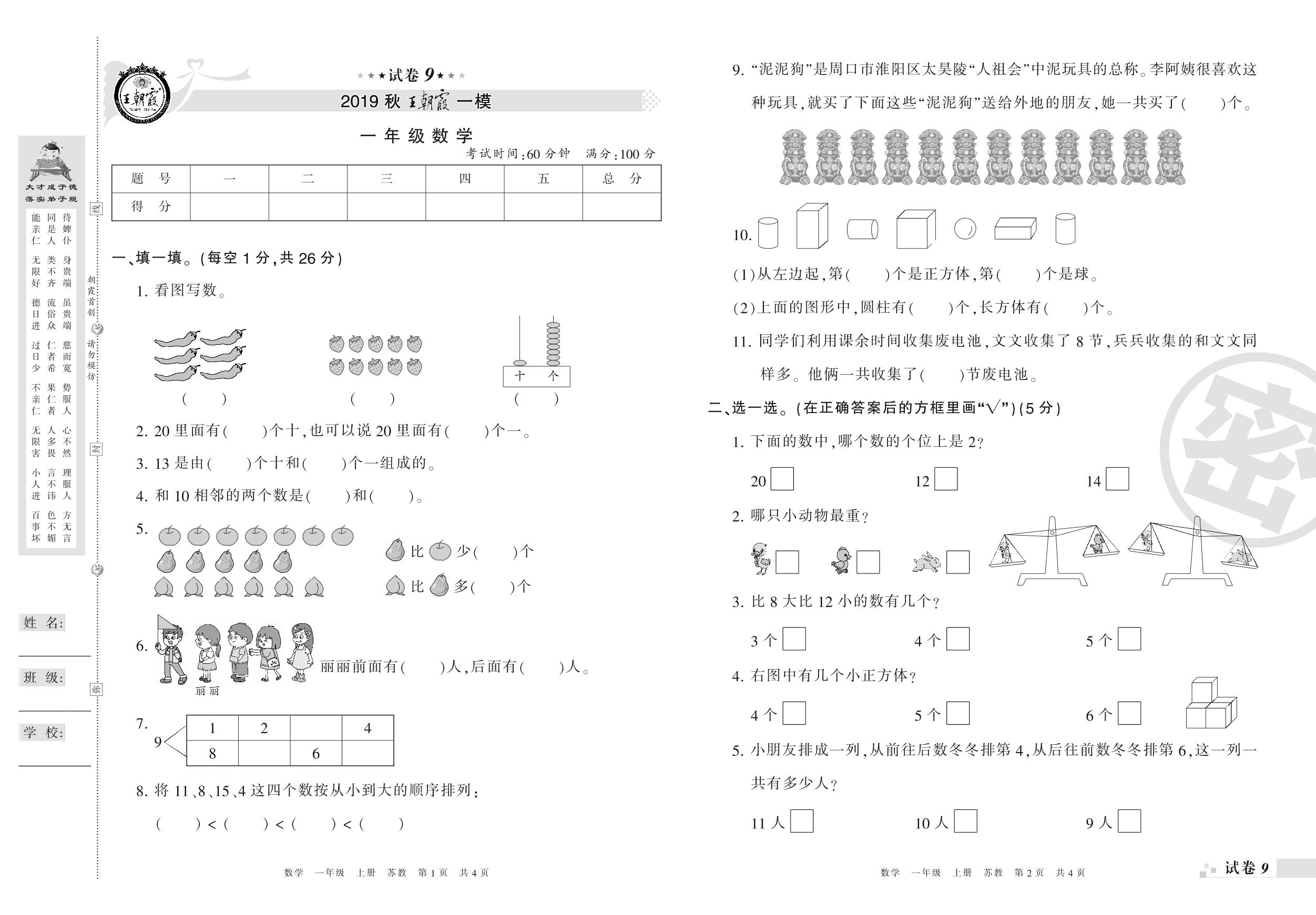 王朝霞期末模拟卷一年级上册数学(苏教版)_R210802215853【9】