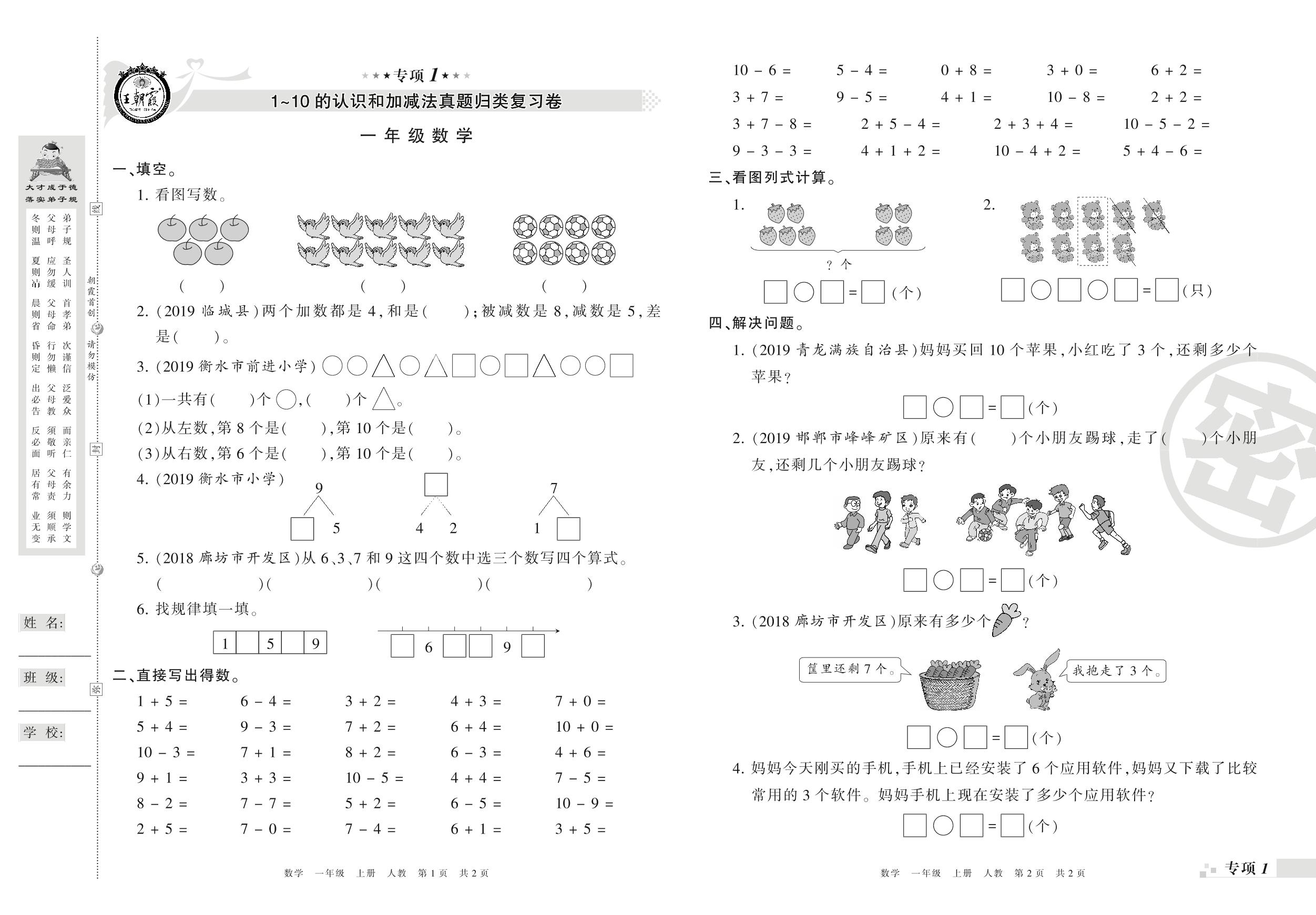 王朝霞期末专项卷——1~10的认识和加减法、11~20各数的认识真题归类复习一年级上册数学(人教版)_R210802215904【0】