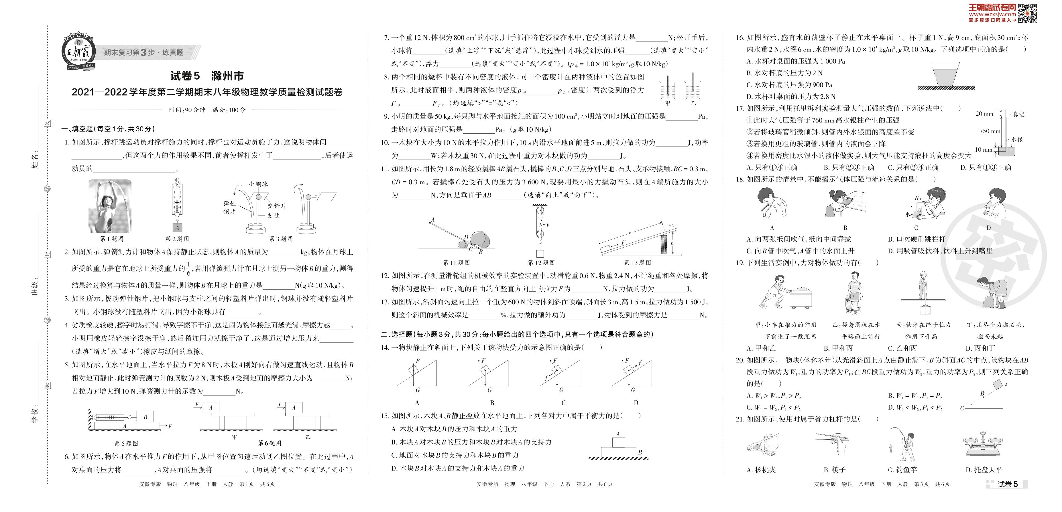 滁州市2021—2022学年度第二学期期末八年级物理教学质量检测试题卷(人教版)【5】