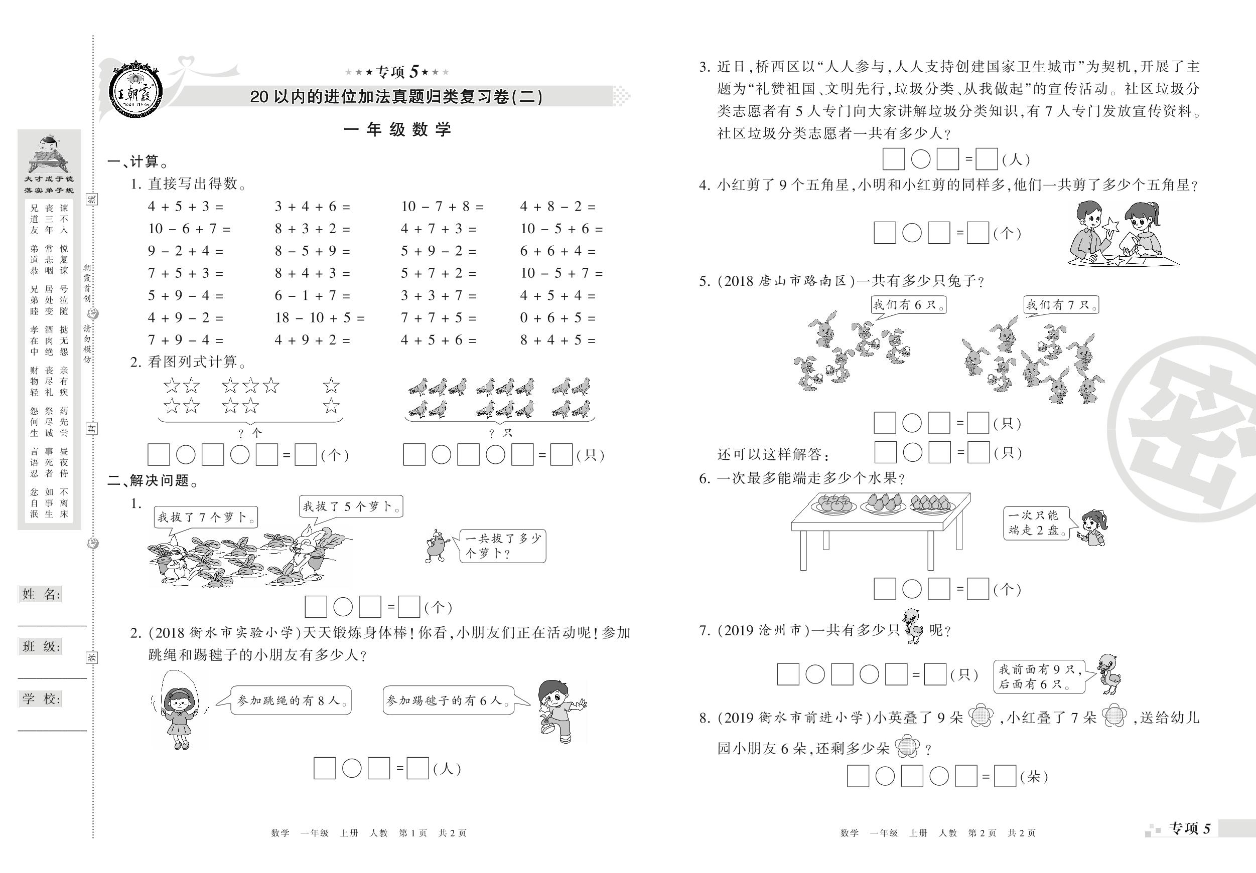 王朝霞期末专项卷——20以内的进位加法、位置、认识图形及钟表真题归类复习一年级上册数学(人教版)_R210802215910【0】
