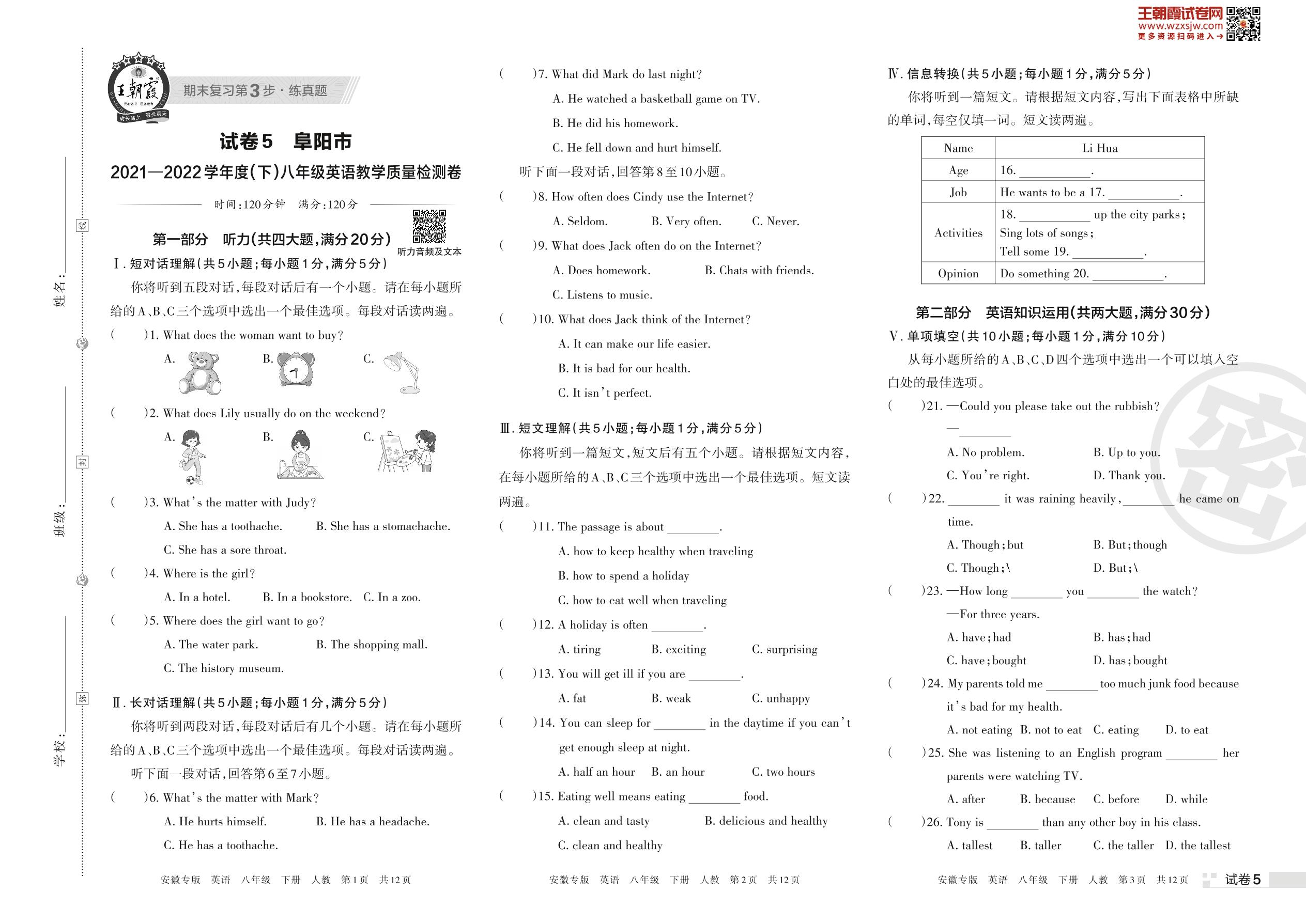 阜阳市2021—2022学年度(下)八年级英语教学质量检测卷(人教版)【5】