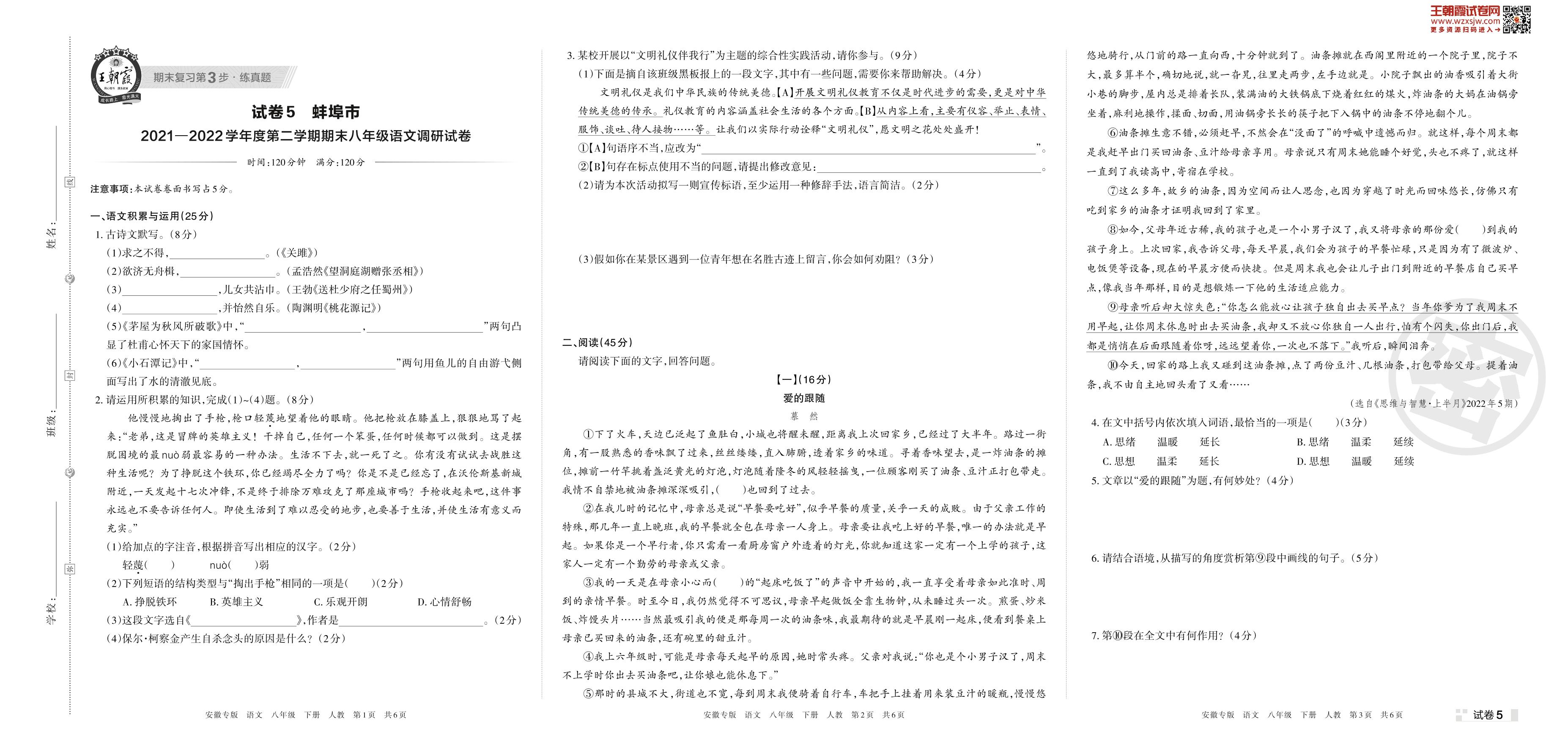 蚌埠市2021—2022学年度第二学期期末八年级语文调研试卷(人教版)【5】