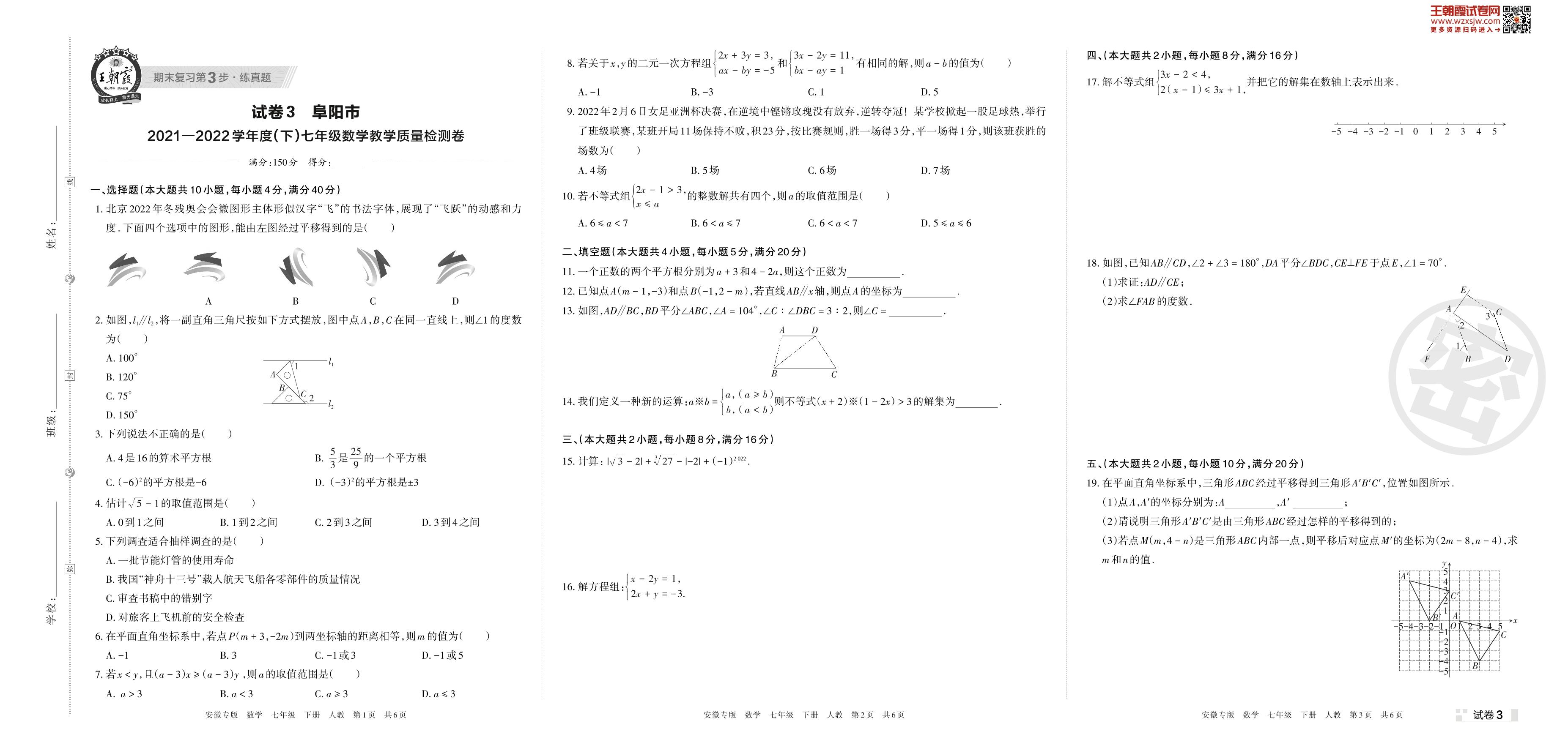 阜阳市2021—2022学年度(下)七年级数学教学质量检测卷(人教版)【3】