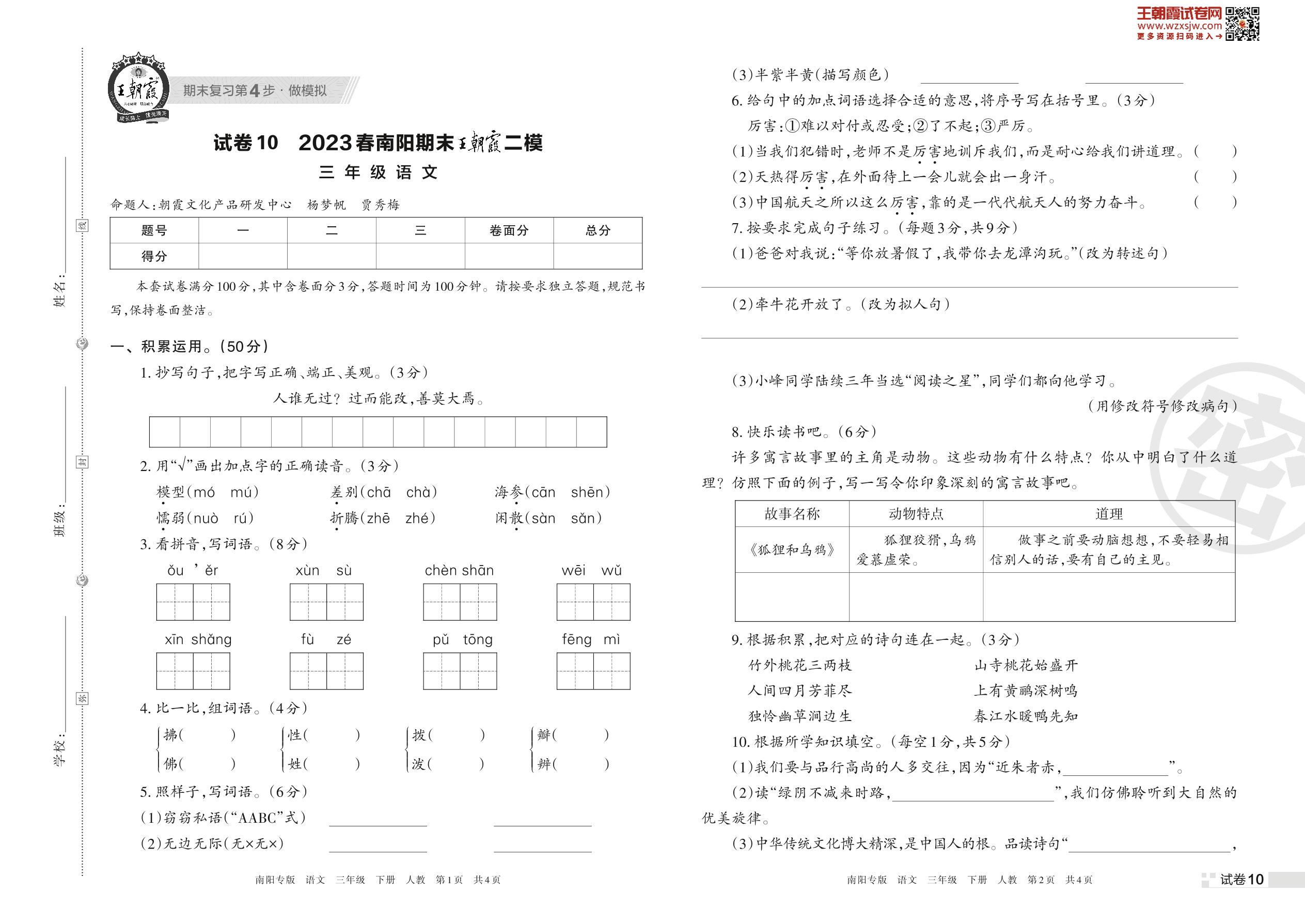 王朝霞期末模拟卷三年级下册语文(人教版)_R230424113203188【10】