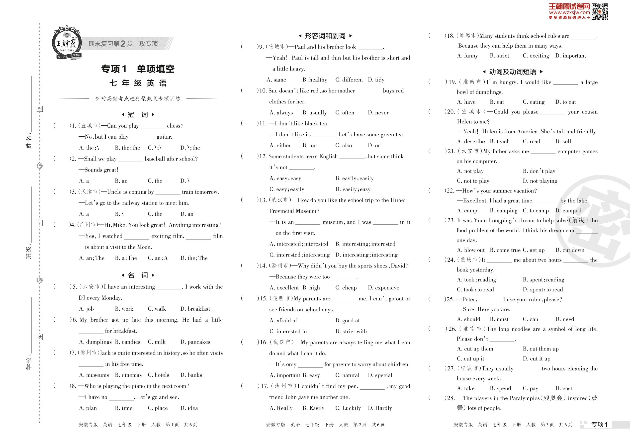 王朝霞期末专项卷——单项填空七年级下册英语(人教版)_R230424113627280【1】
