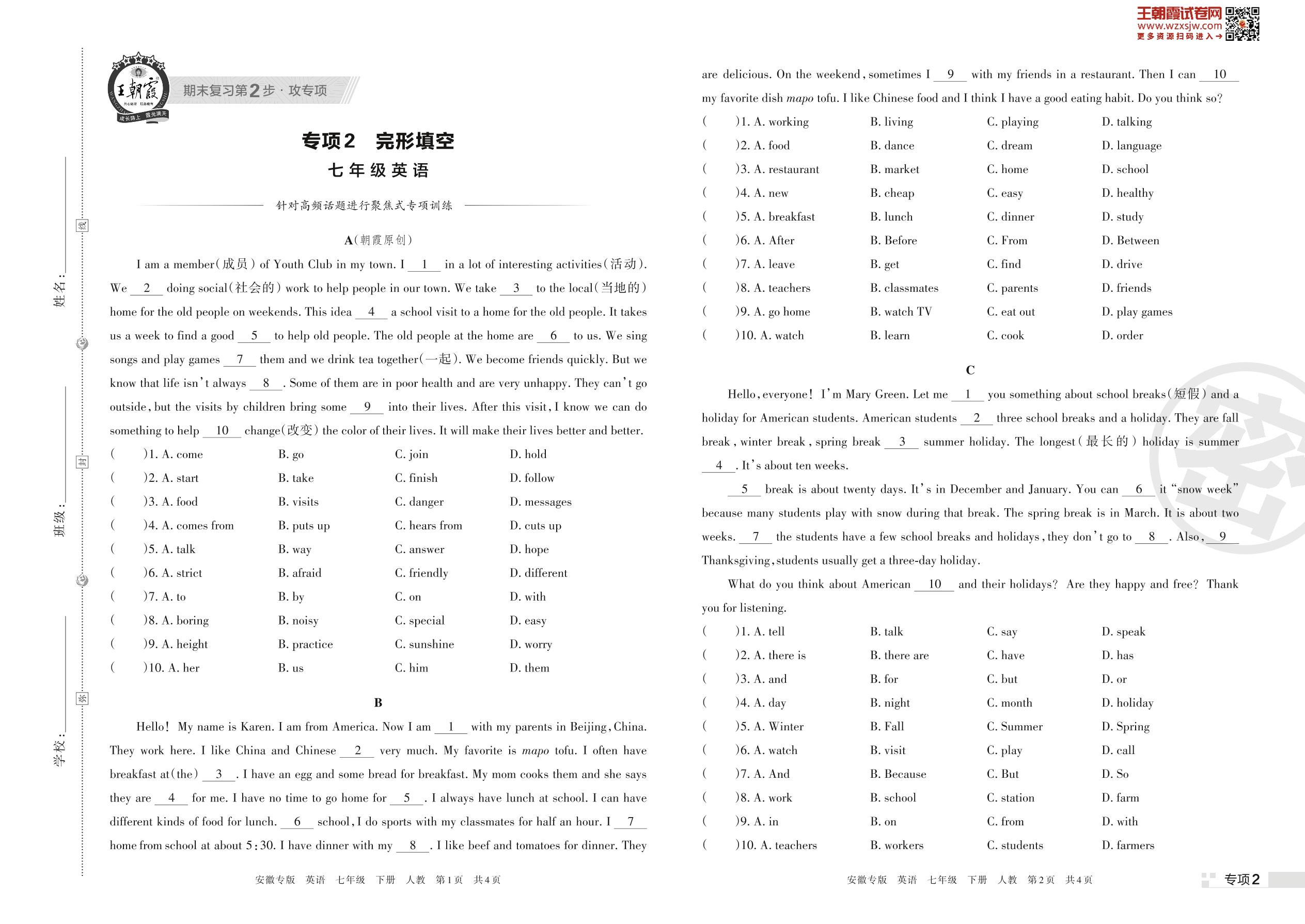 王朝霞期末专项卷——完形填空七年级下册英语(人教版)_R230424113627836【2】