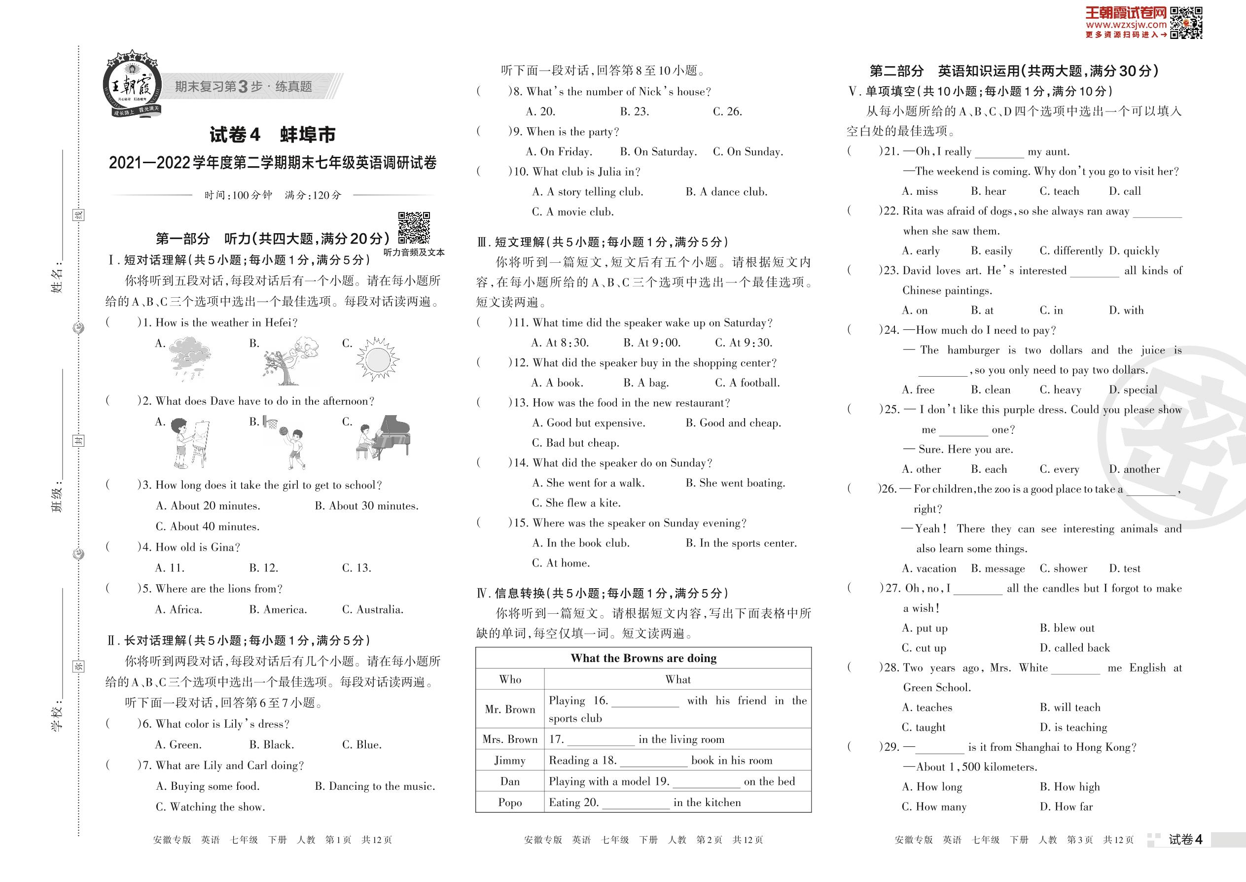 蚌埠市2021—2022学年度第二学期期末七年级英语调研试卷(人教版)【4】