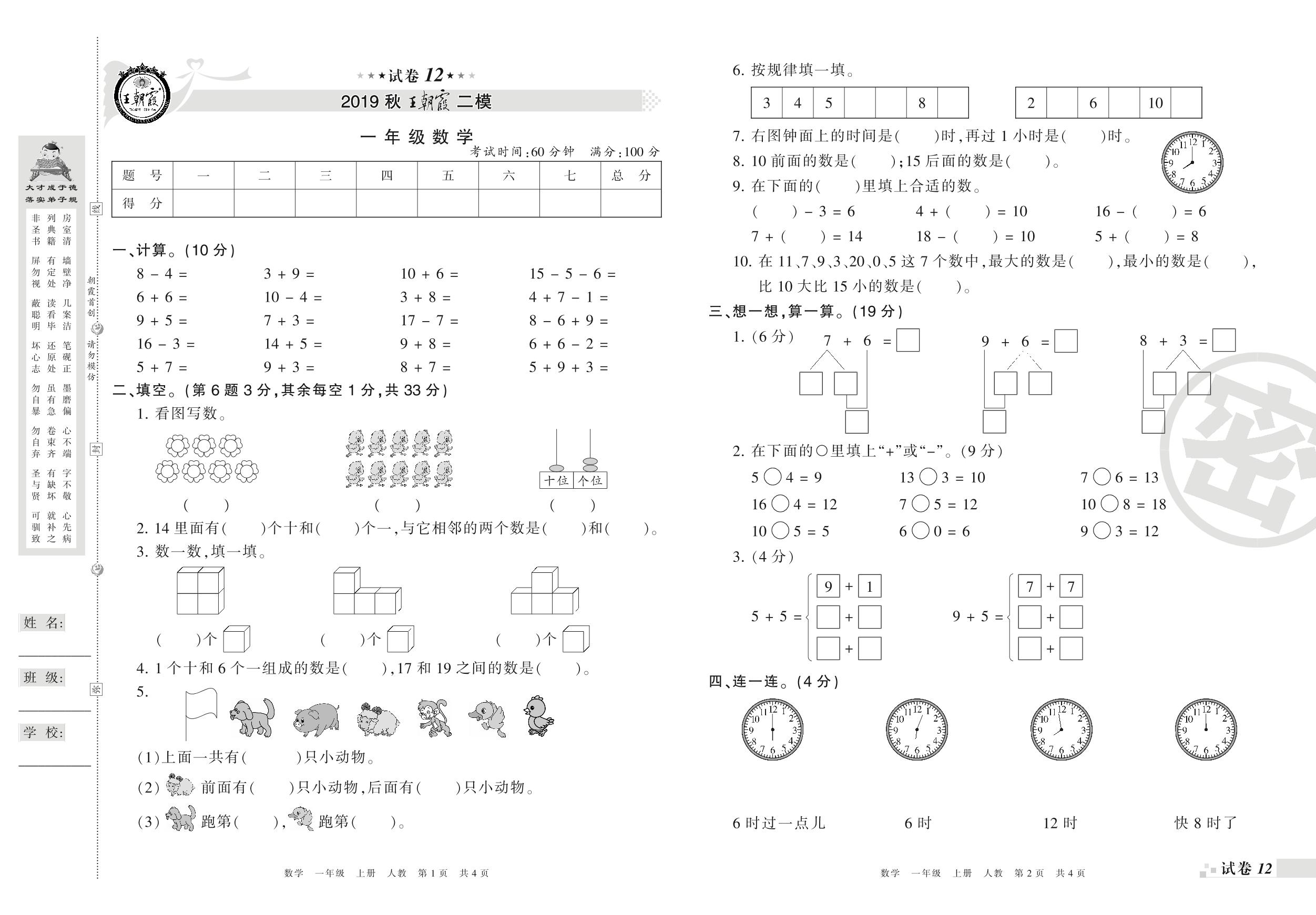 王朝霞期末模拟卷一年级上册数学(人教版)【12】