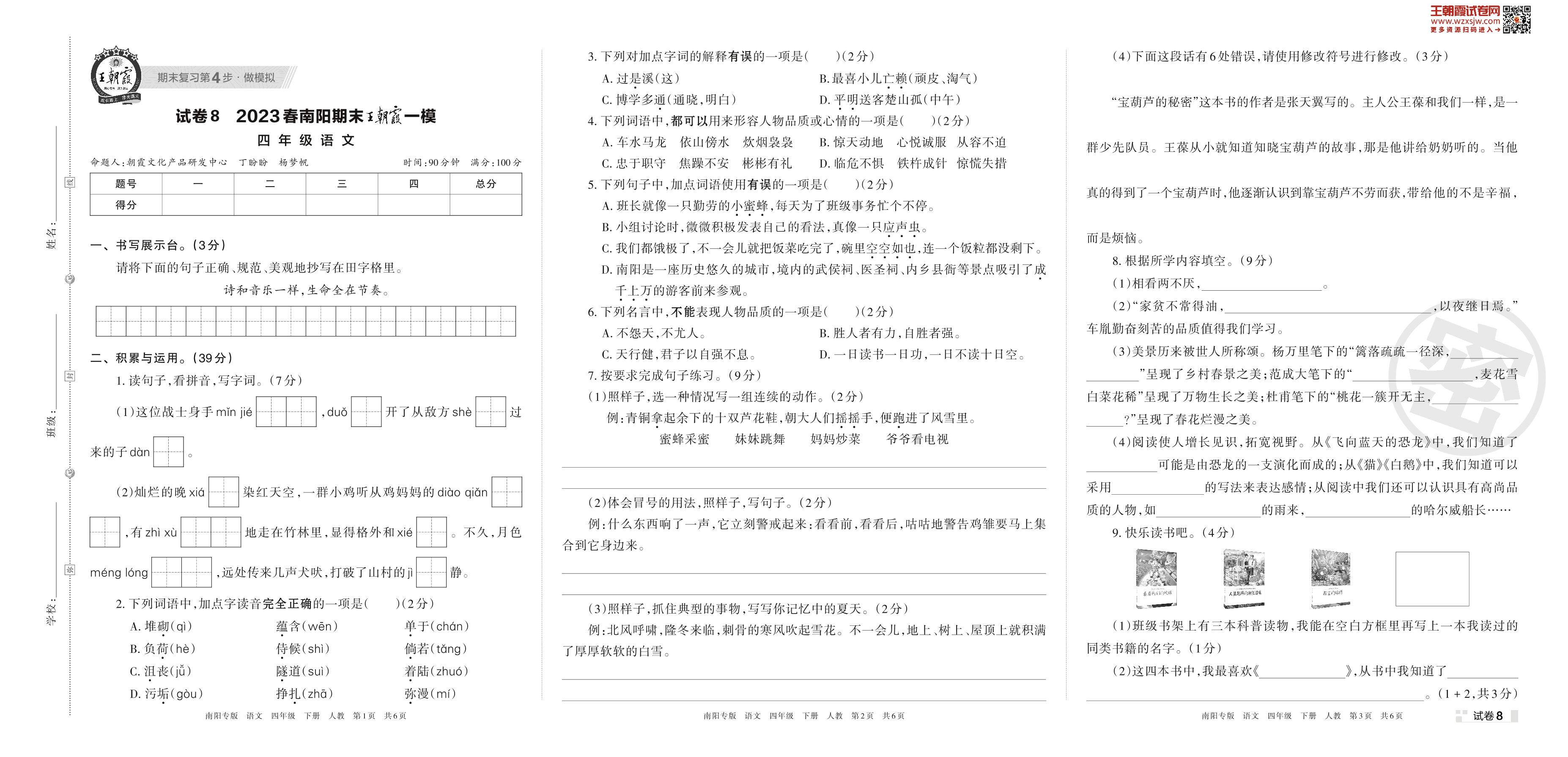 王朝霞期末模拟卷四年级下册语文(人教版)_R230424113710736【8】