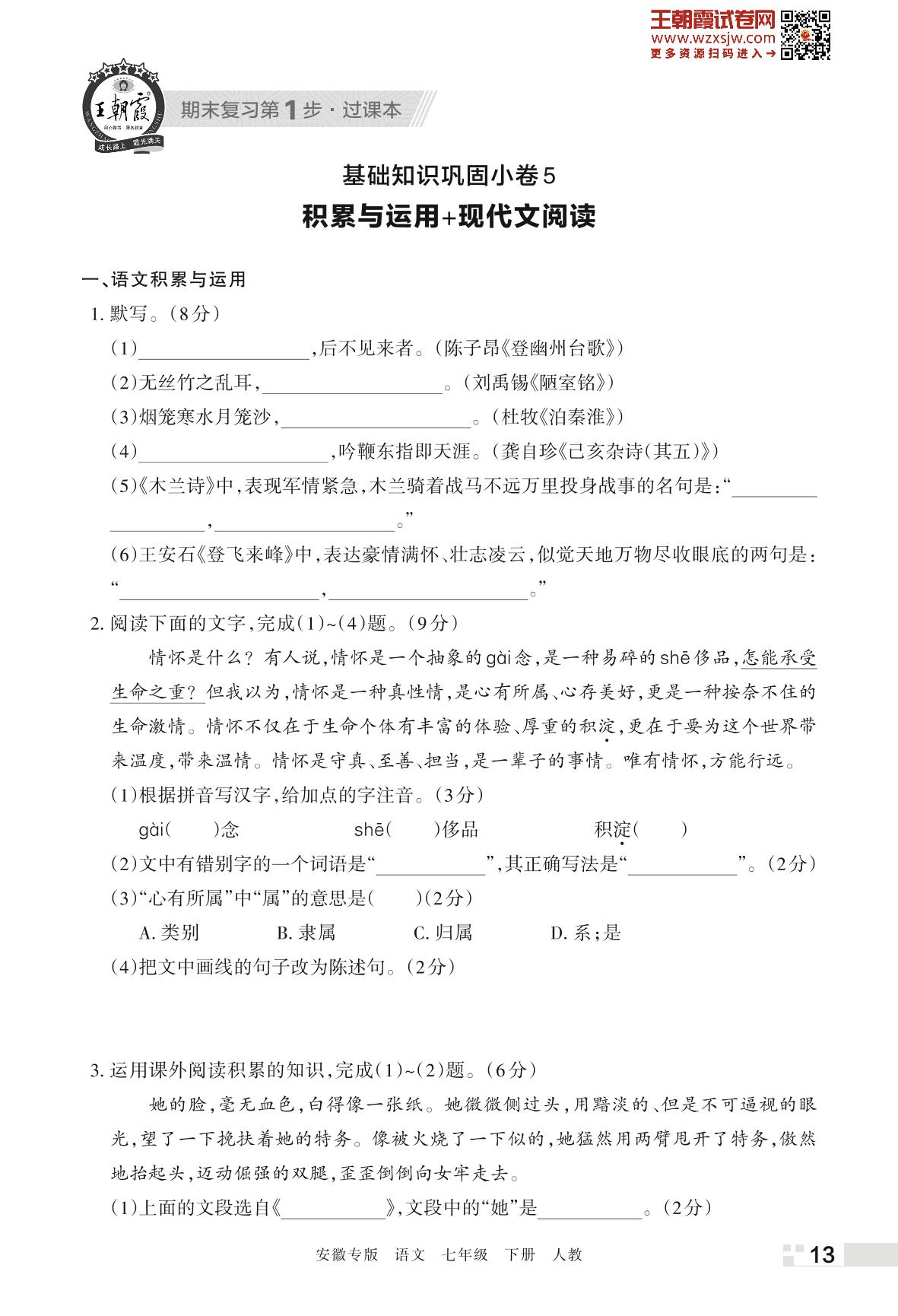 王朝霞期末过课本——基础知识巩固小卷5七年级下册语文(人教版)