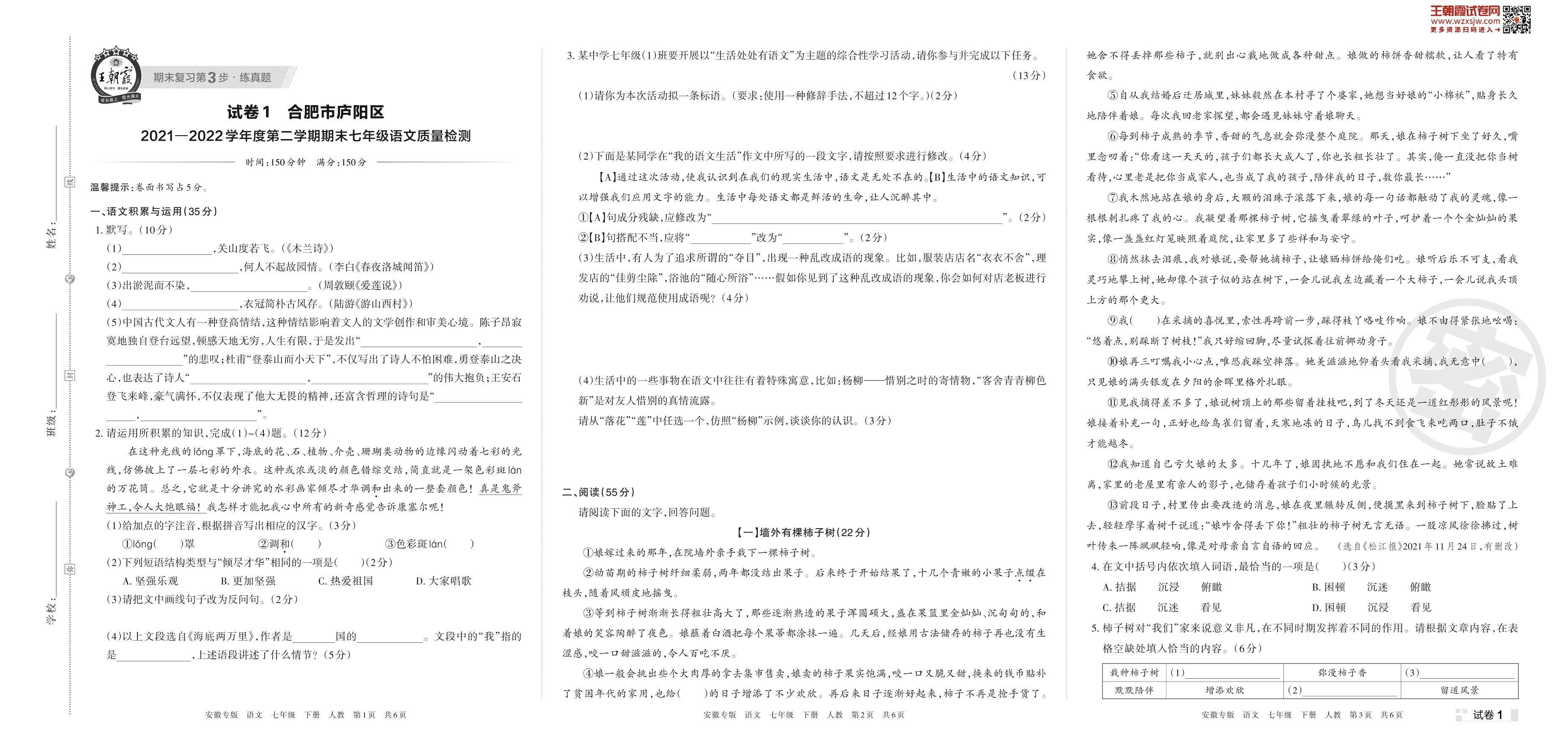 合肥市庐阳区2021—2022学年度第二学期期末七年级语文质量检测(人教版)【1】