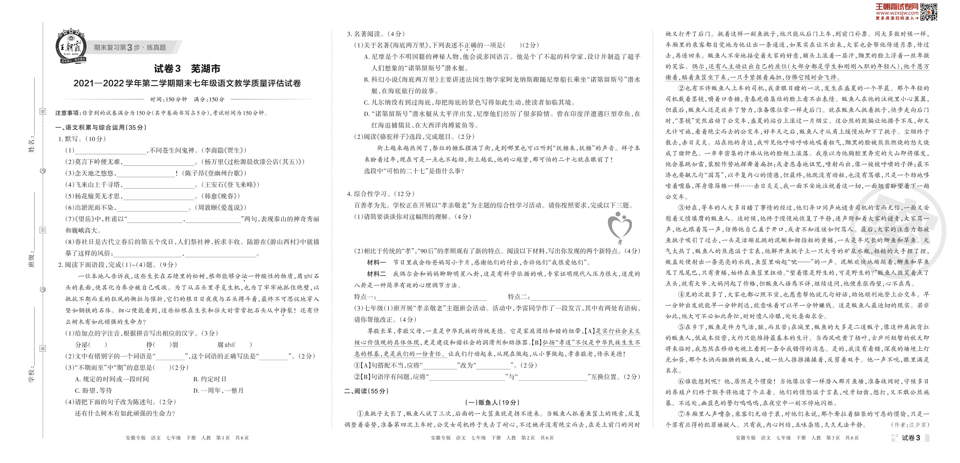芜湖市2021—2022学年第二学期期末七年级语文教学质量评估试卷(人教版)【3】