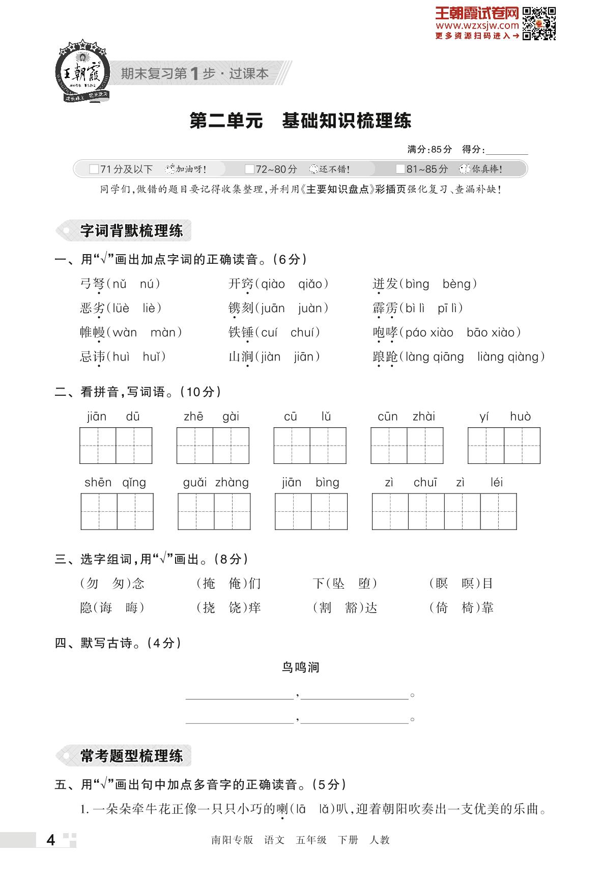 王朝霞期末过课本——第二单元 基础知识梳理练五年级下册语文(人教版)_R230424115312015