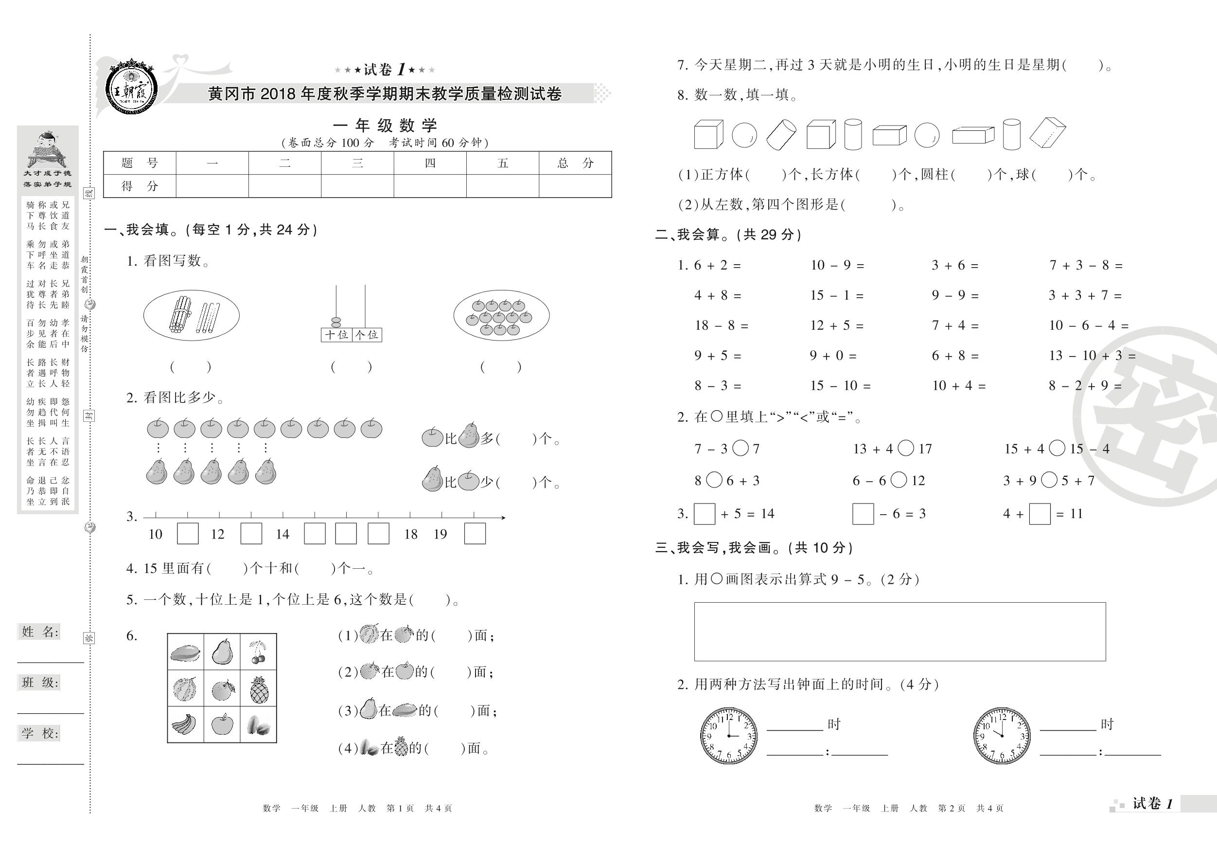 2018-2019学年第一学期黄冈市一年级数学试卷(人教版)【1】
