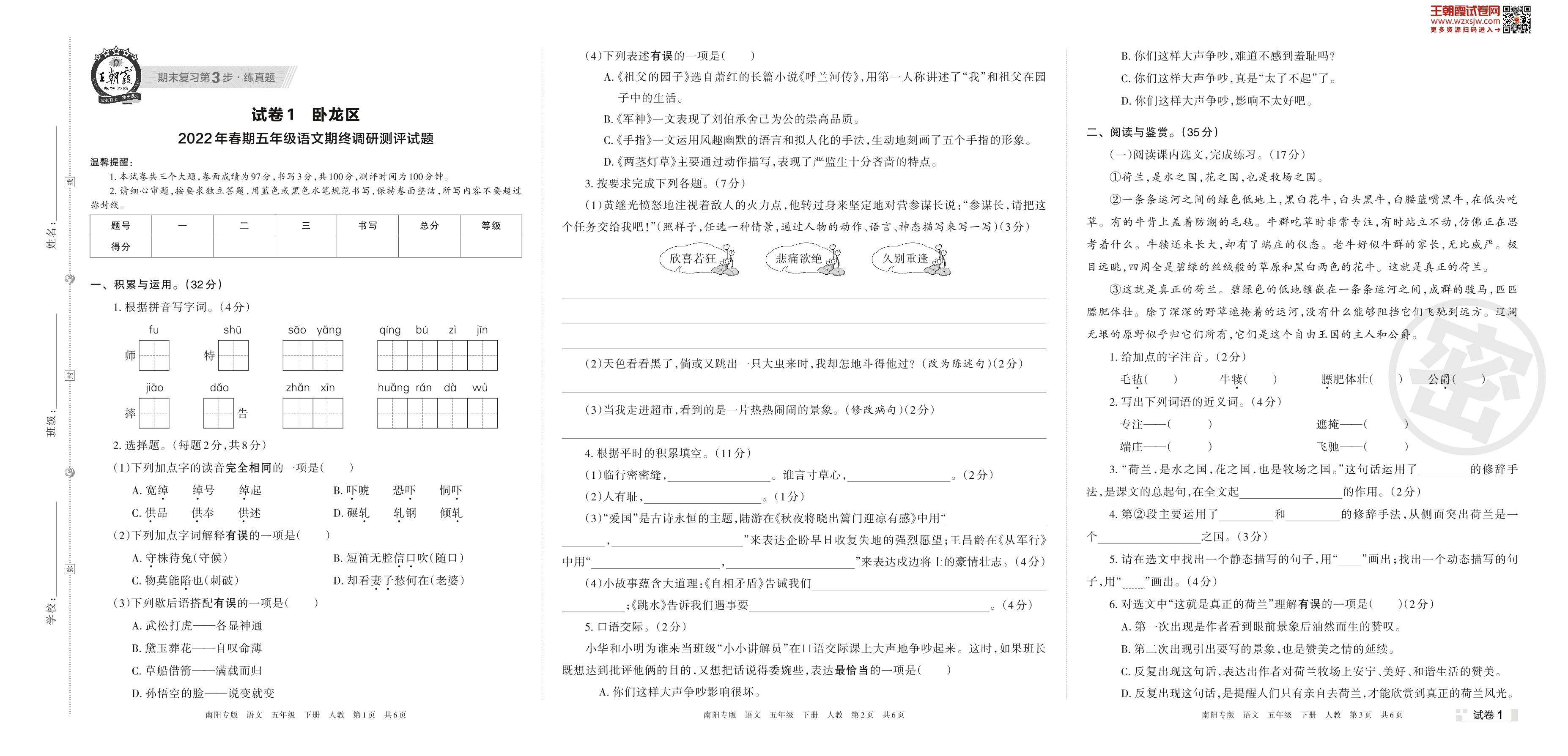 卧龙区2022年春期五年级语文期终调研测评试题(人教版)【1】