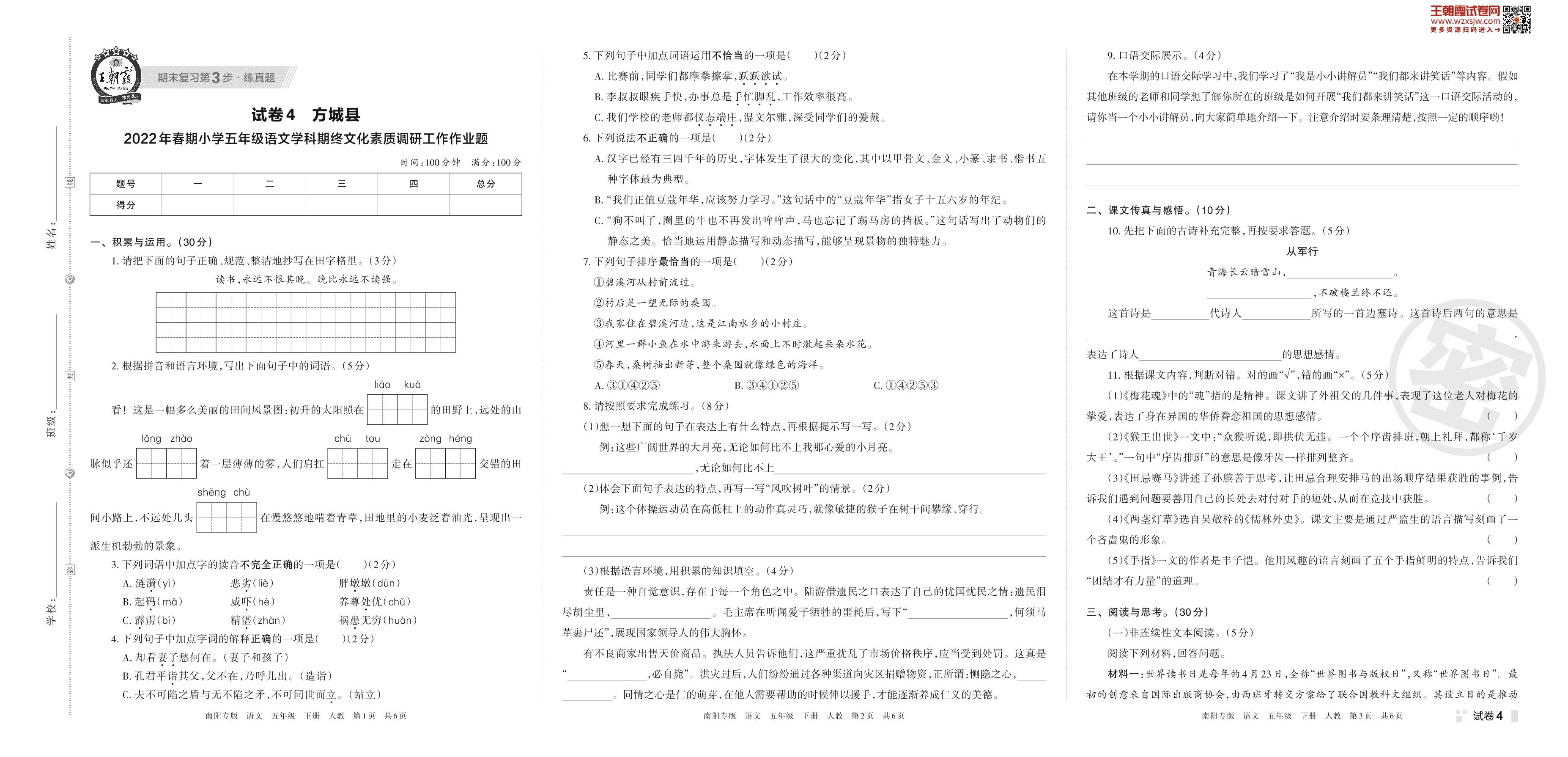 方城县2022年春期小学五年级语文学科期终文化素质调研工作作业题(人教版)【4】