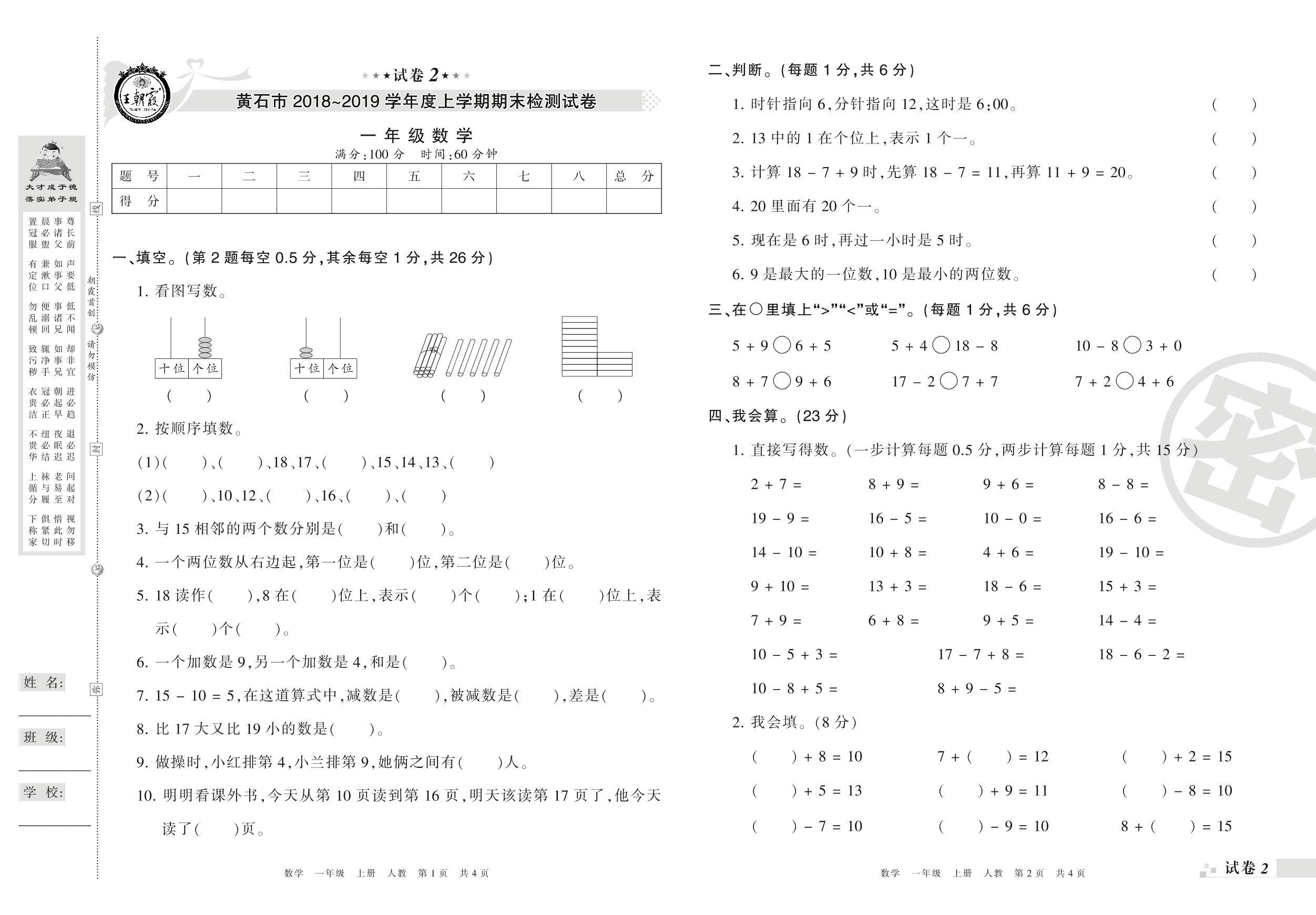 2018-2019学年第一学期黄石市一年级数学试卷(人教版)【2】
