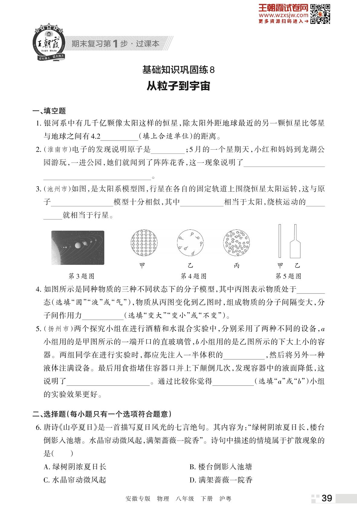 王朝霞期末过课本——基础知识巩固练 8 从粒子到宇宙八年级下册物理(沪粤版)