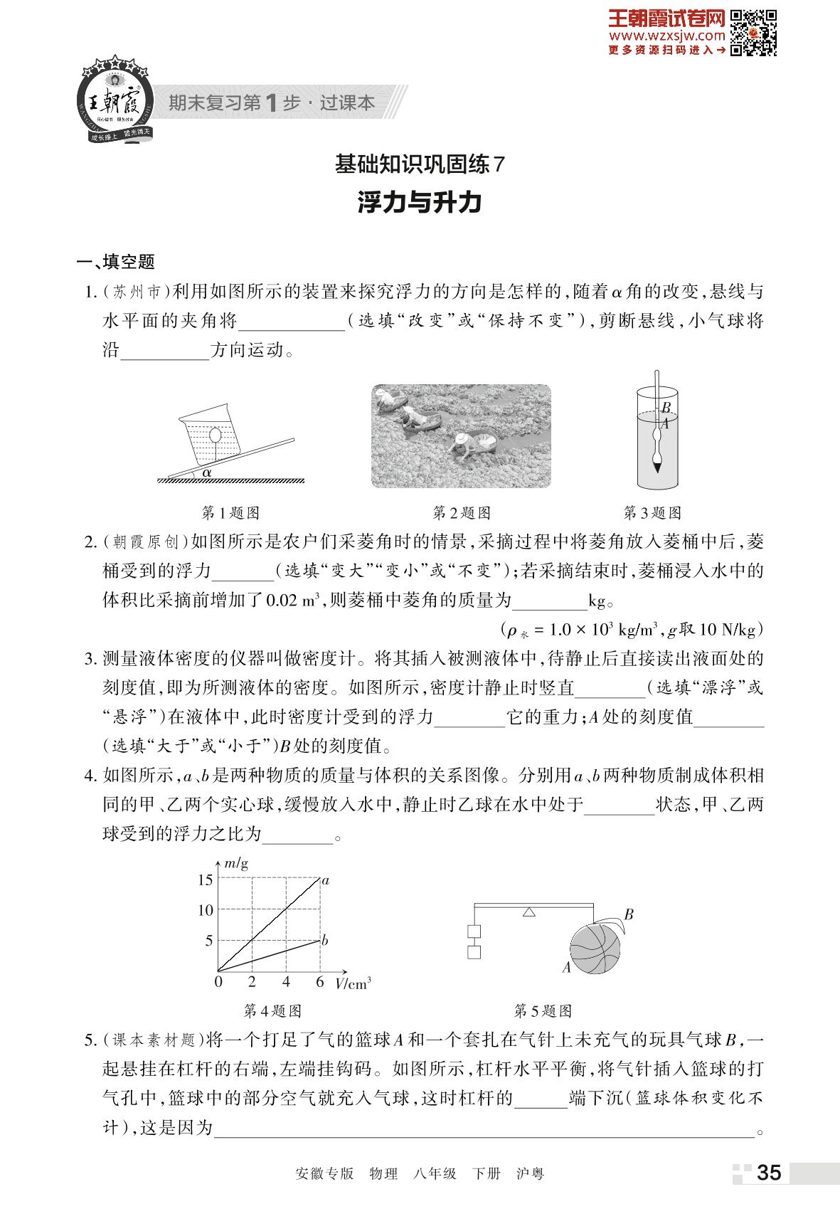 王朝霞期末过课本——基础知识巩固练 7 浮力与升力八年级下册物理(沪粤版)