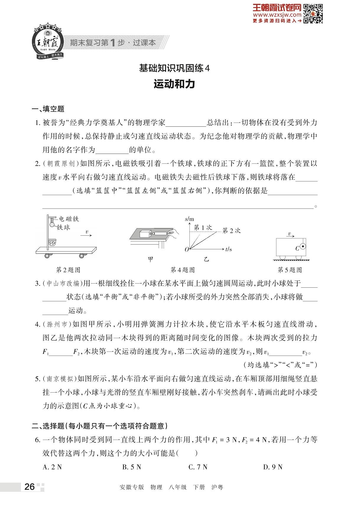 王朝霞期末过课本——基础知识巩固练 4 运动和力八年级下册物理(沪粤版)