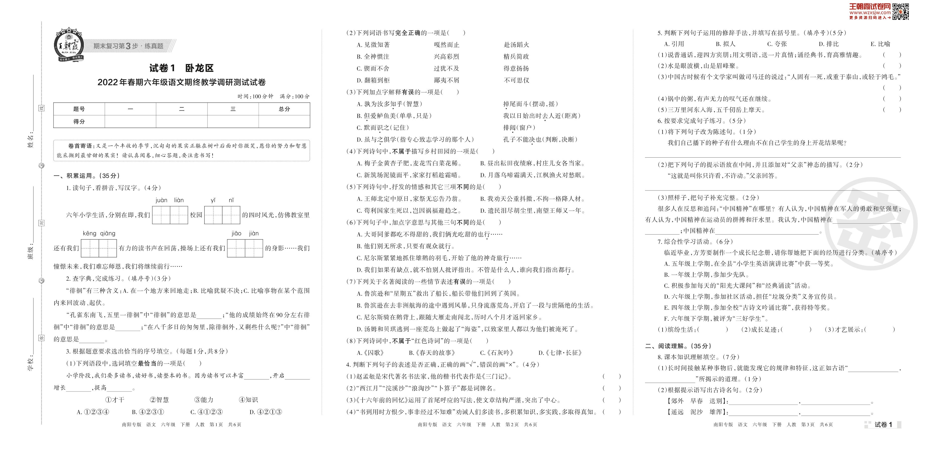 卧龙区2022年春期六年级语文期终教学调研测试试卷(人教版)【1】
