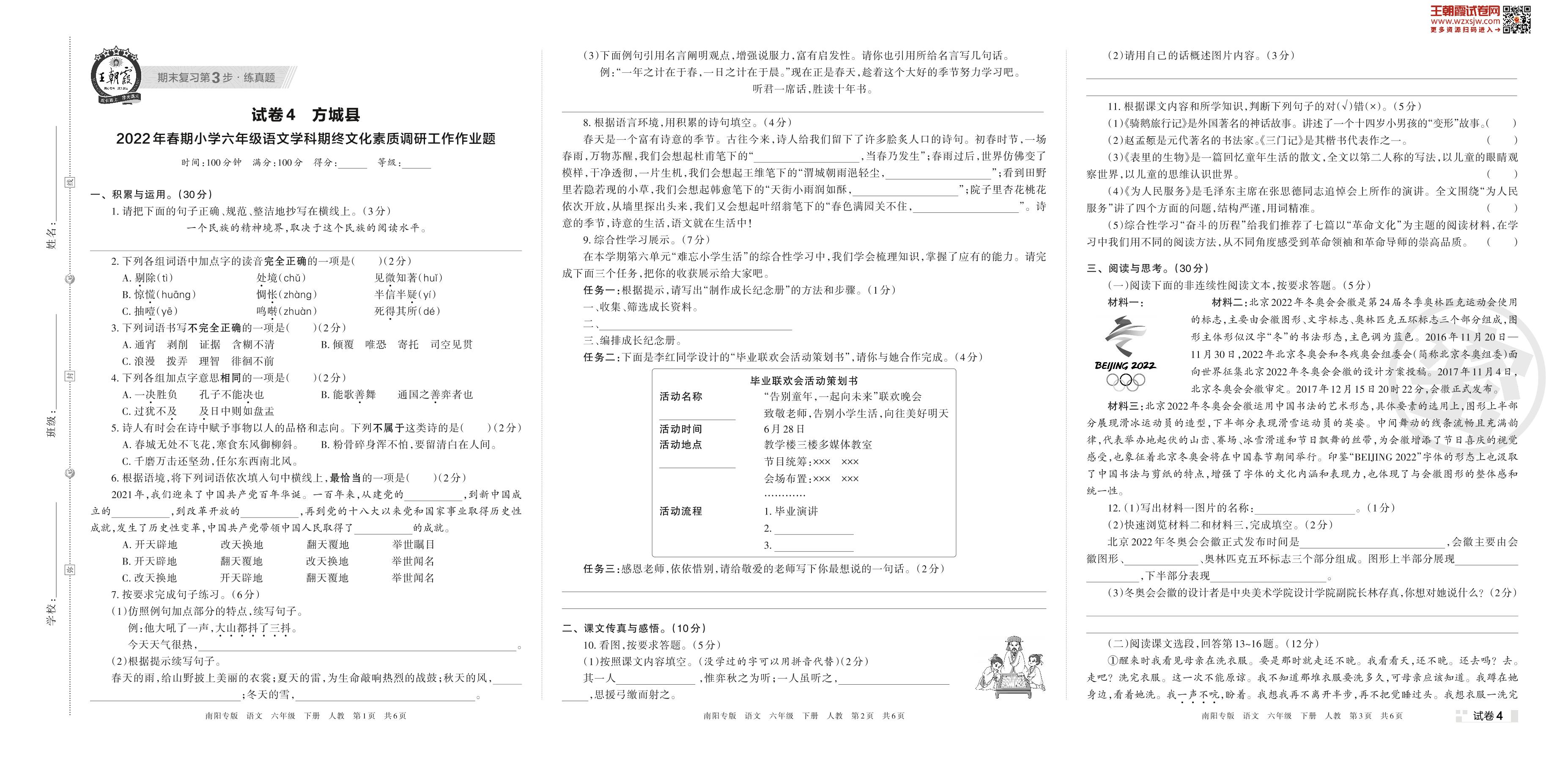 方城县2022年春期小学六年级语文学科期终文化素质调研工作作业题(人教版)【4】