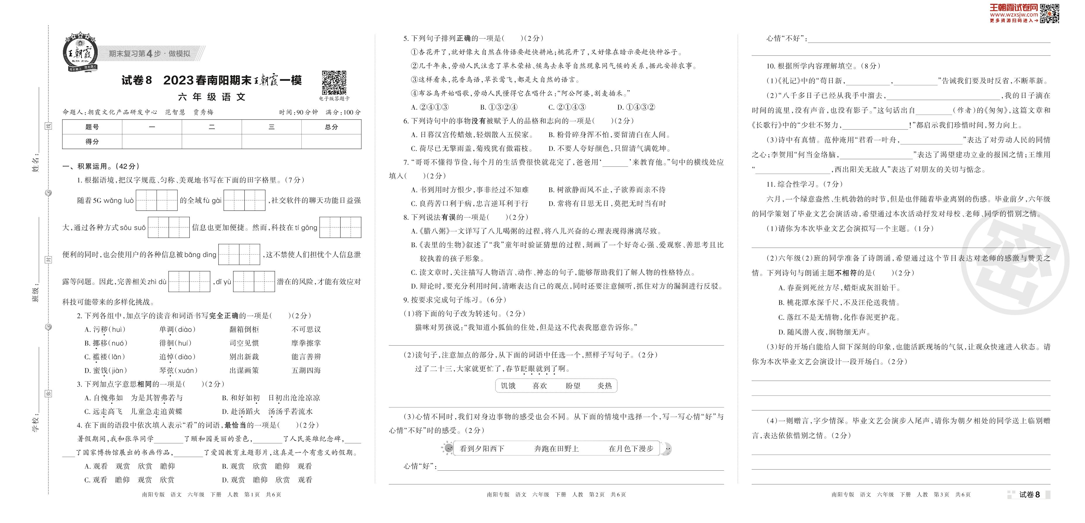 王朝霞期末模拟卷六年级下册语文(人教版)_R230424115831232【8】